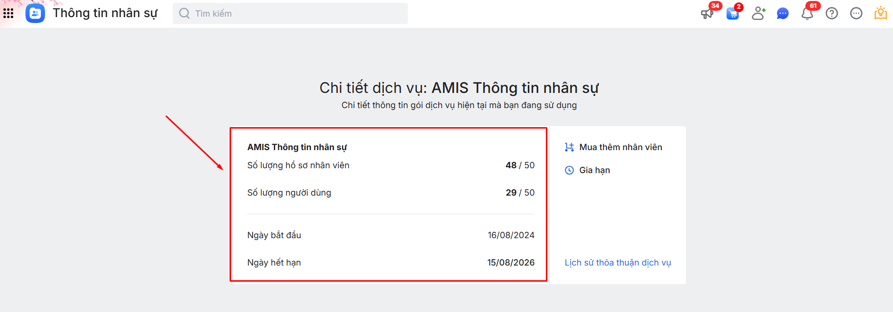 Bài viết hướng dẫn cách thực hiện kiểm tra thông tin tài nguyên (số lượng hồ sơ nhân viên, số lượng người dùng, hạn sử dụng phần mềm) doanh nghiệp đã sử dụng/đã mua trên phần mềm để có thể chủ động thực hiện gia hạn, mua thêm tài nguyên tránh gián đoạn quá trình thực hiện công việc trên phần mềm.