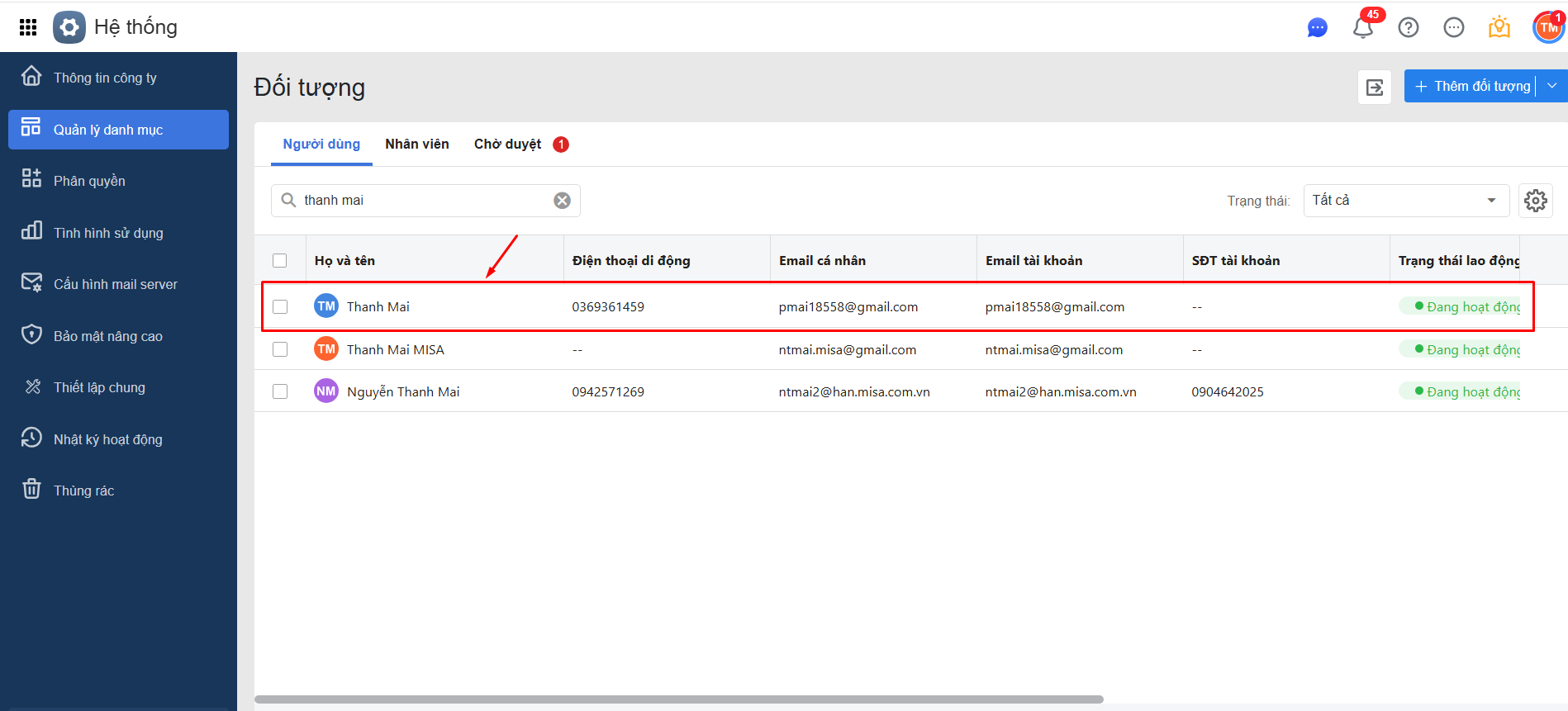 Bước 1: Truy cập vào Hệ thống\ Thêm người dùng vào Hệ thống và kích hoạt tài khoản người dùng.