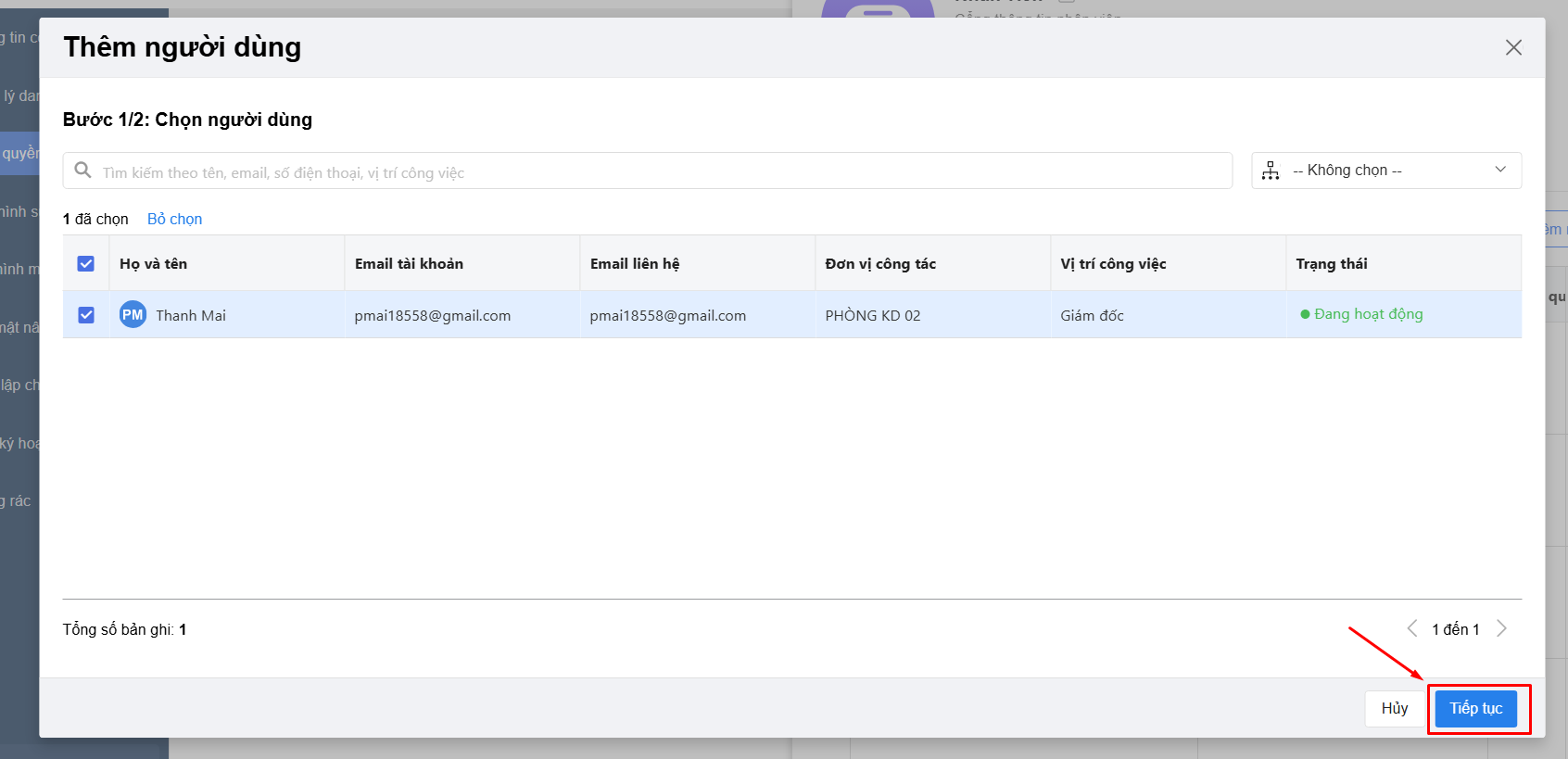 Bước 4: Tích chọn người dùng\ Nhấn Tiếp tục.