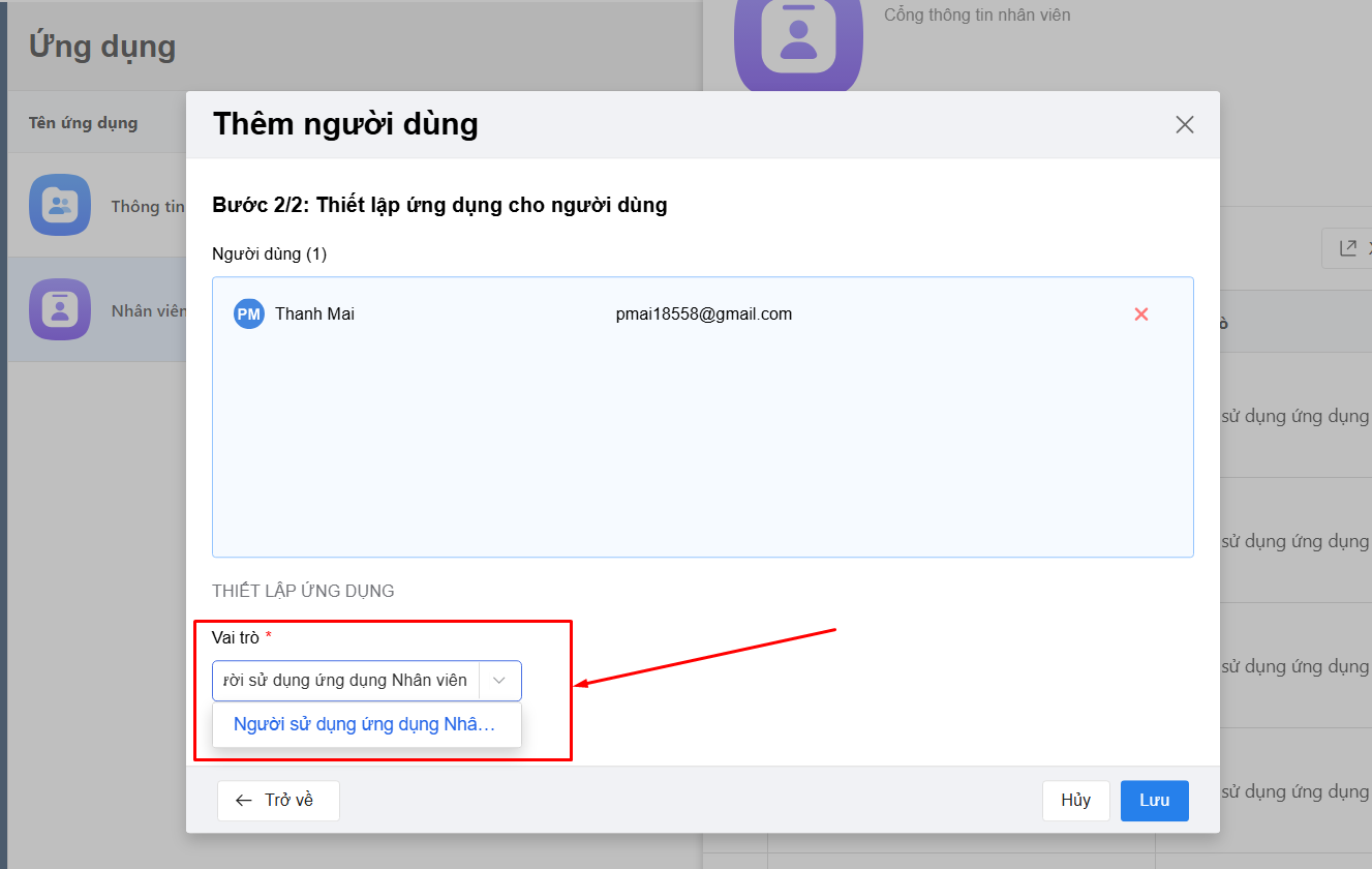 Bước 3: Tìm ứng dụng Nhân viên\ Nhấn Thêm người dùng.