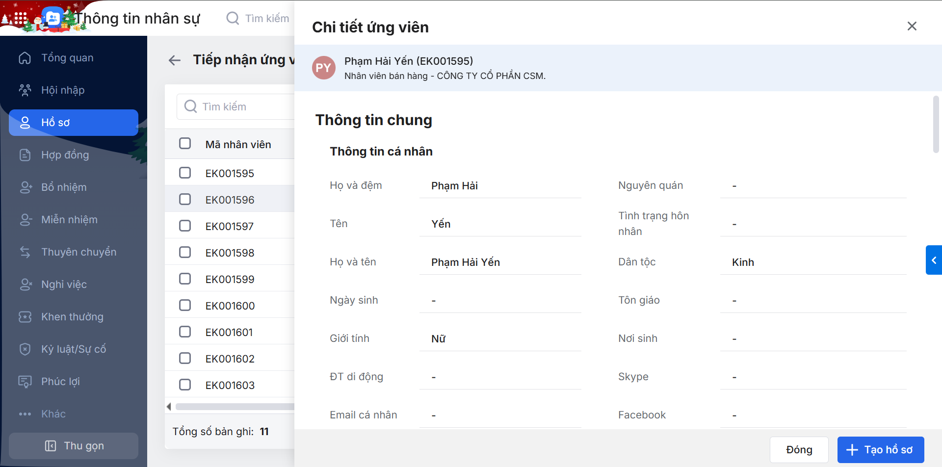 • Tích vào ứng viên để xem chi tiết ứng viên \ sau đó chọn Tạo hồ sơ