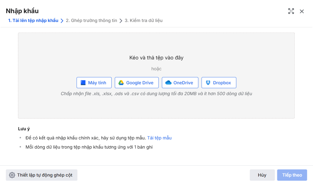 Bước 3: Tải tệp mẫu về máy, nhập dữ liệu theo đúng cấu trúc của tệp, rồi đẩy tệp lên hệ thống để tiến hành nhập khẩu dữ liệu.