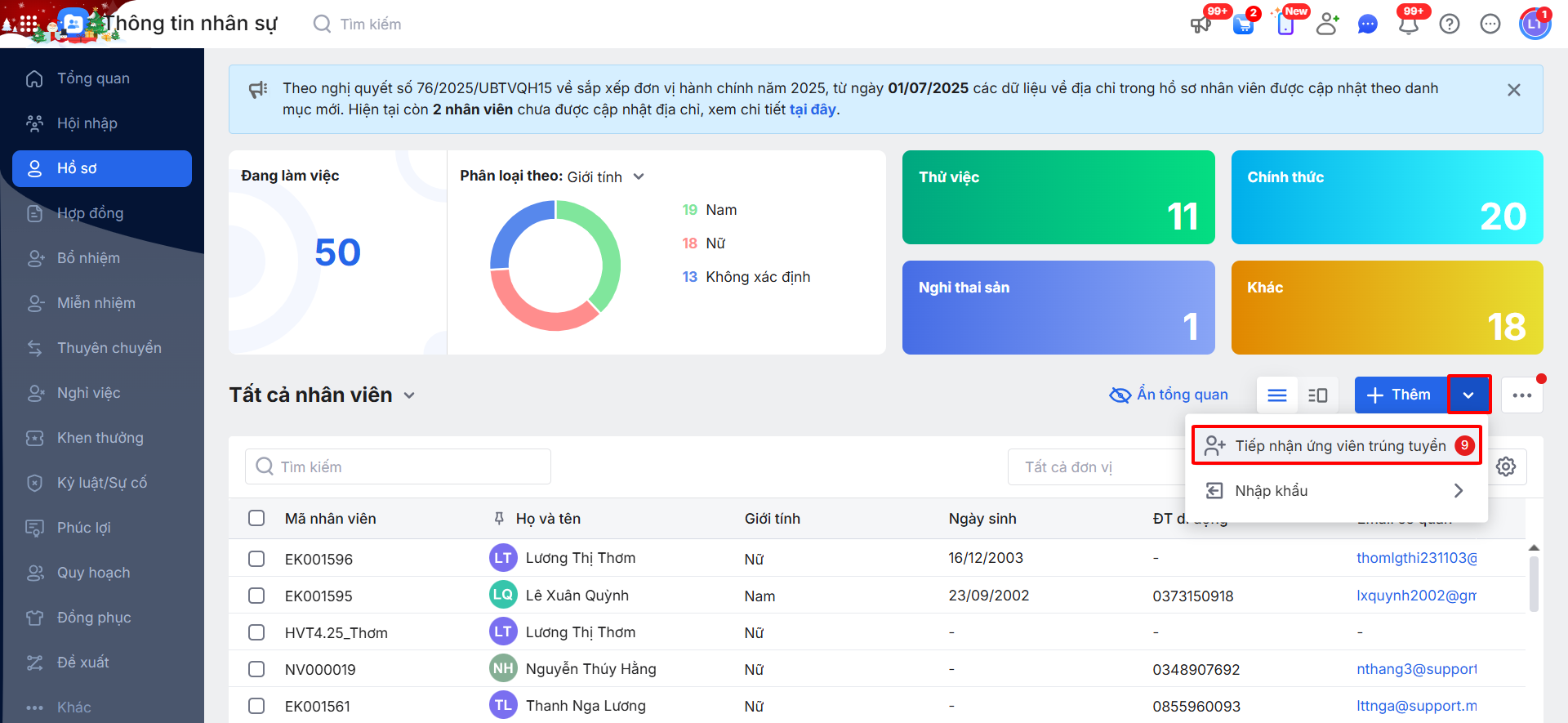 Bước 1: Tại phân hệ Hồ sơ \ nhấn biểu tượng mũi tên xuống cạnh nút Thêm \ chọn Tiếp nhận ứng viên trúng tuyển.