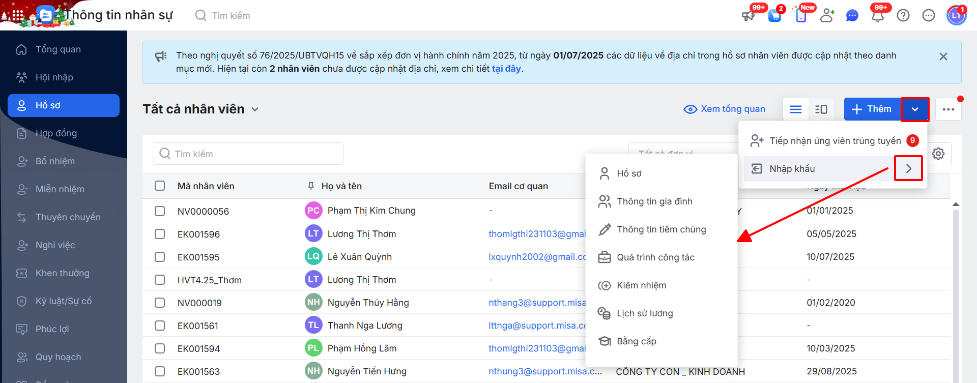 • Để nhập khẩu danh sách hồ sơ nhân viên: chọn Hồ sơ