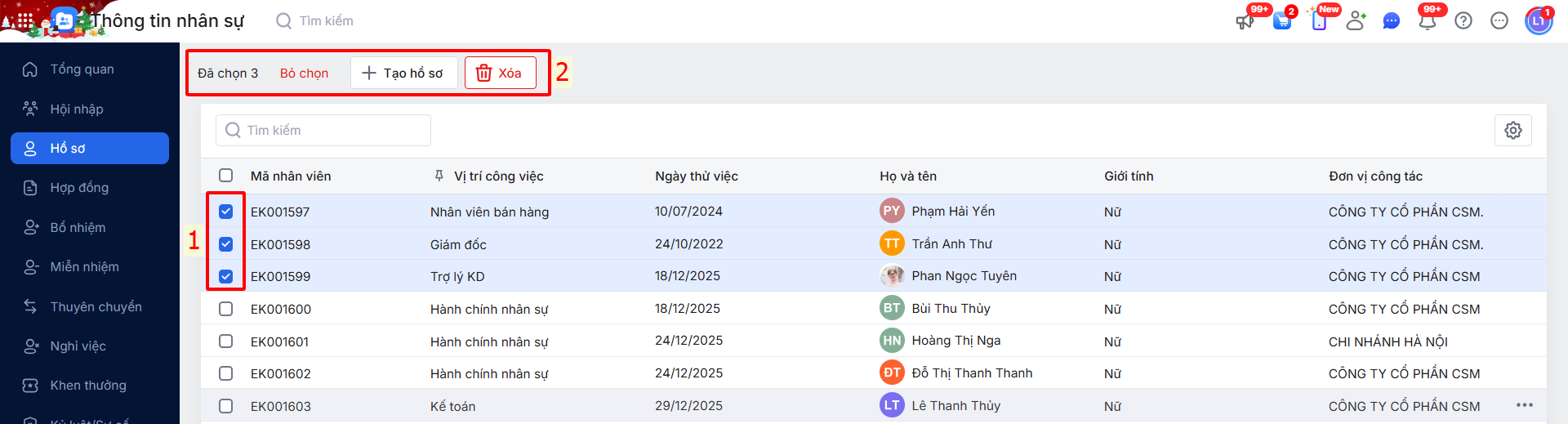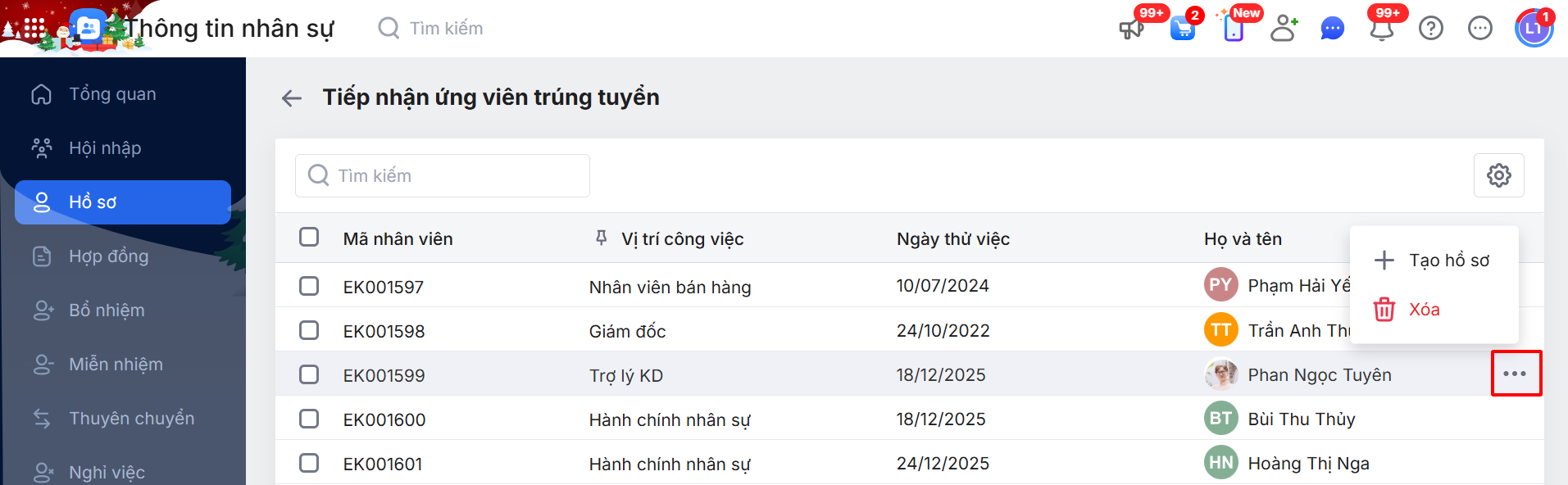 • Hoặc di chuột vào từng bản ghi \ nhấn vào dấu ba chấm … \ chọn Tạo hồ sơ/Xóa