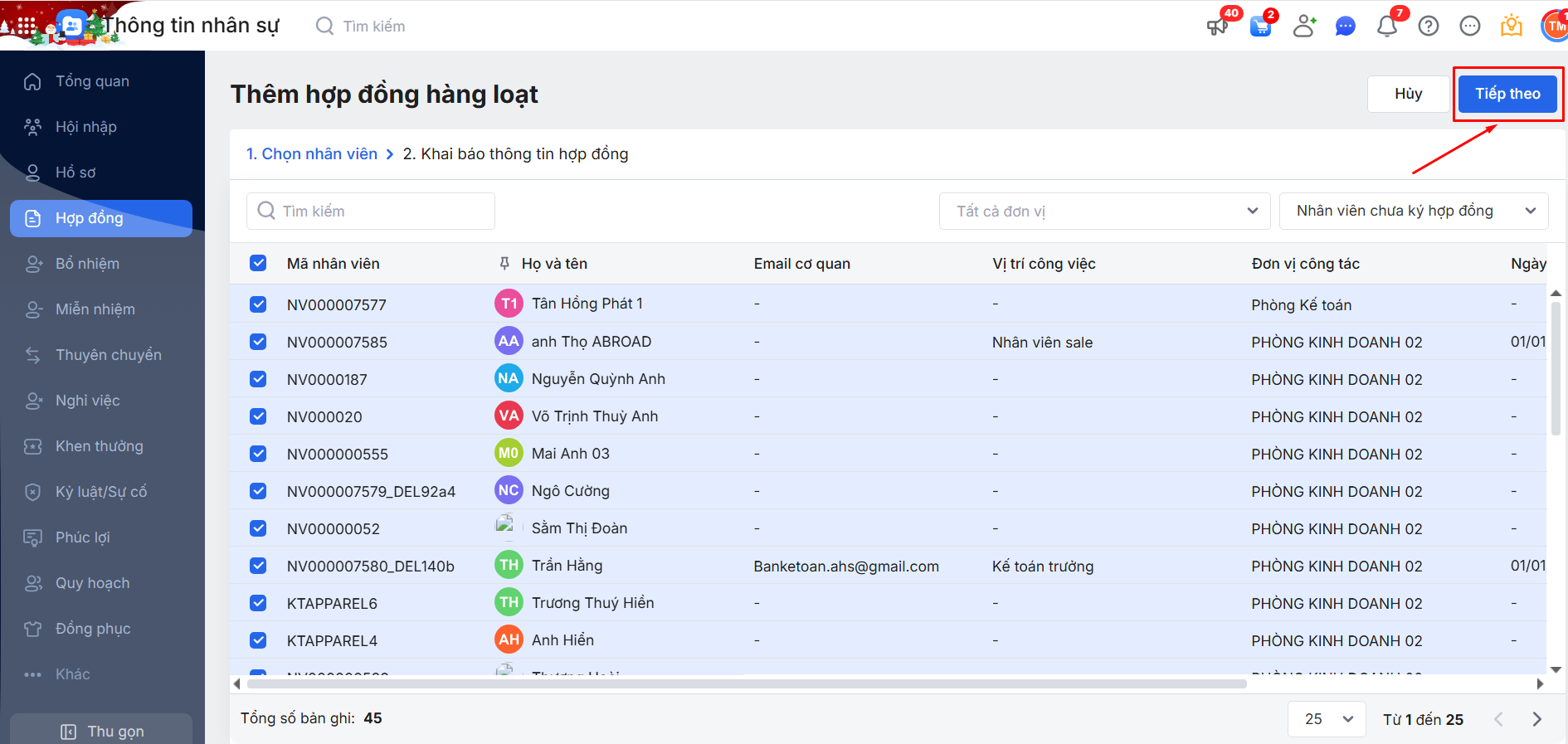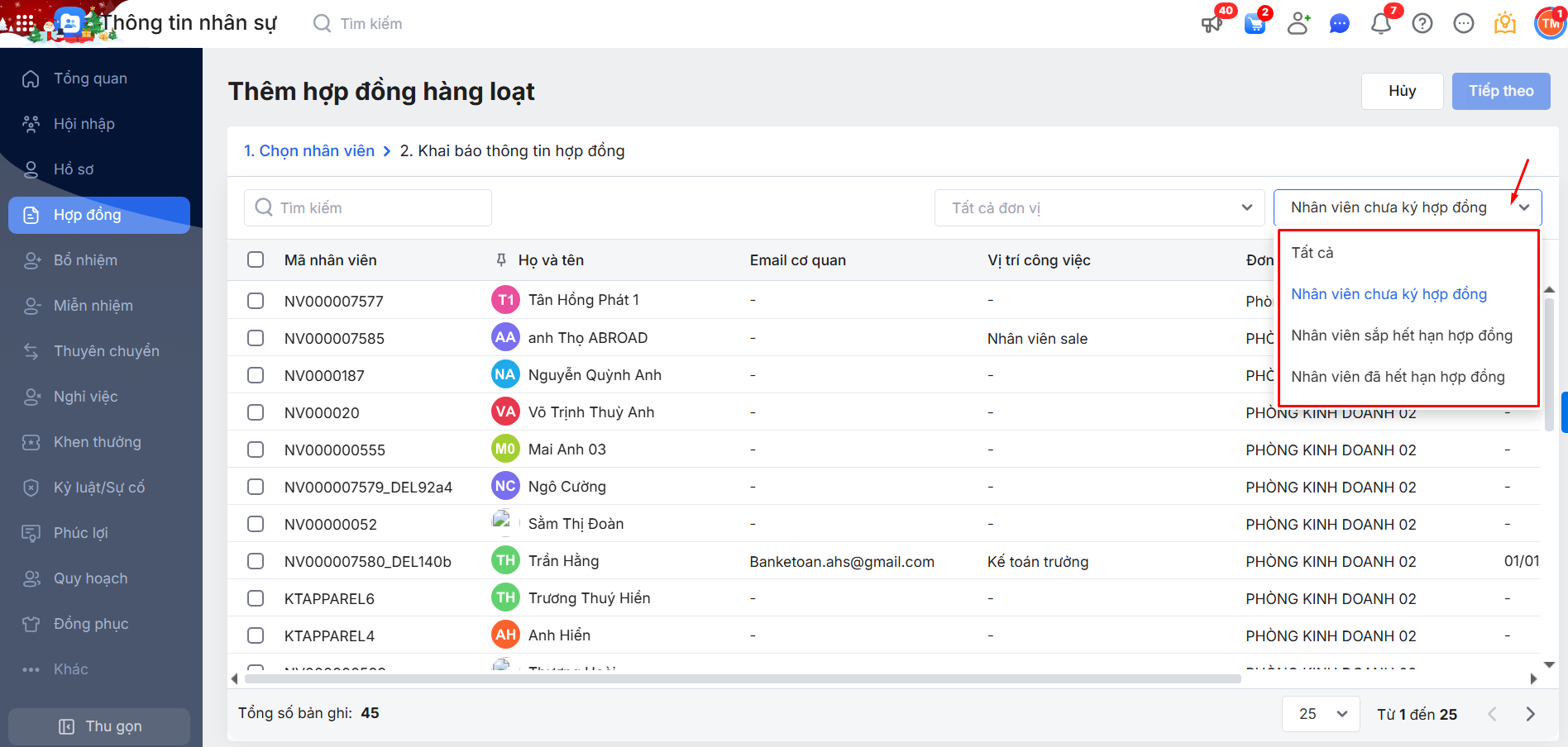 Bước 2: Chọn nhân viên lập Hợp đồng: Tích chọn các nhân viên\ Có thể sử dụng bộ lọc nhanh có sẵn để lọc ra danh sách nhân viên mong muốn: