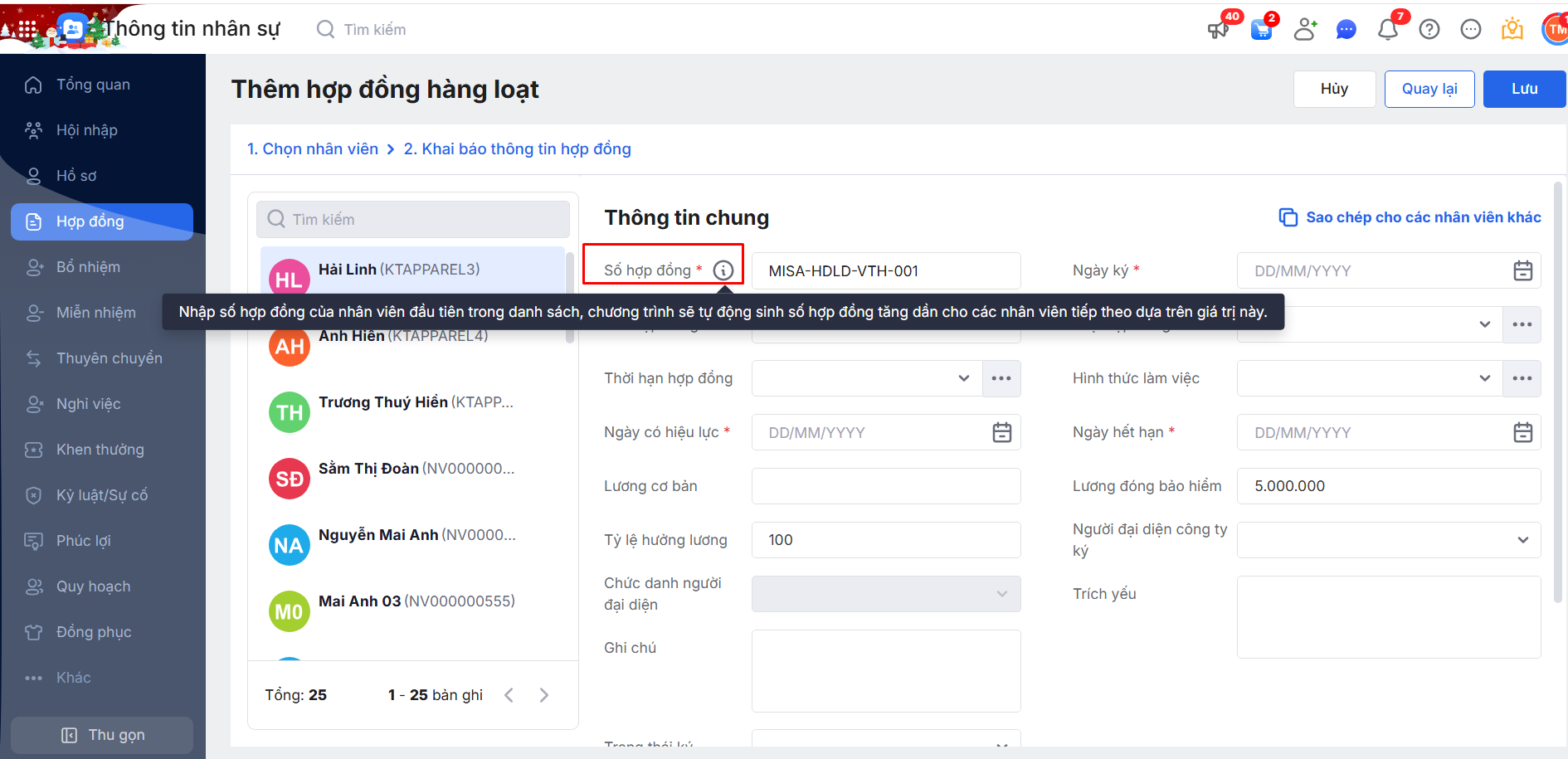 • Riêng với trường Số hợp đồng thì chỉ cần nhập số hợp đồng của nhân viên đầu tiên trong danh sách, chương trình sẽ tự động sinh số tăng dần cho các nhân viên tiếp theo. Ví dụ: Tạo hợp đồng cho 3 nhân viên, số hợp đồng của nhân viên 1 là HDLD-MISA/2022/124 thì số hợp đồng của nhân viên 2, 3 sẽ lần lượt là HDLD-MISA/2022/125 và HDLD-MISA/2022/126.