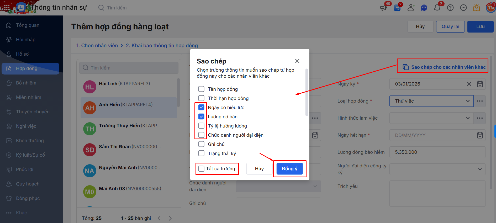 • Đối với các trường hợp thông tin của các nhân viên tương tự nhau, có thể sử dụng tiện ích “Sao chép cho các nhân viên khác“\ Chọn các trường thông tin muốn sao chép\ Nhấn Đồng ý.