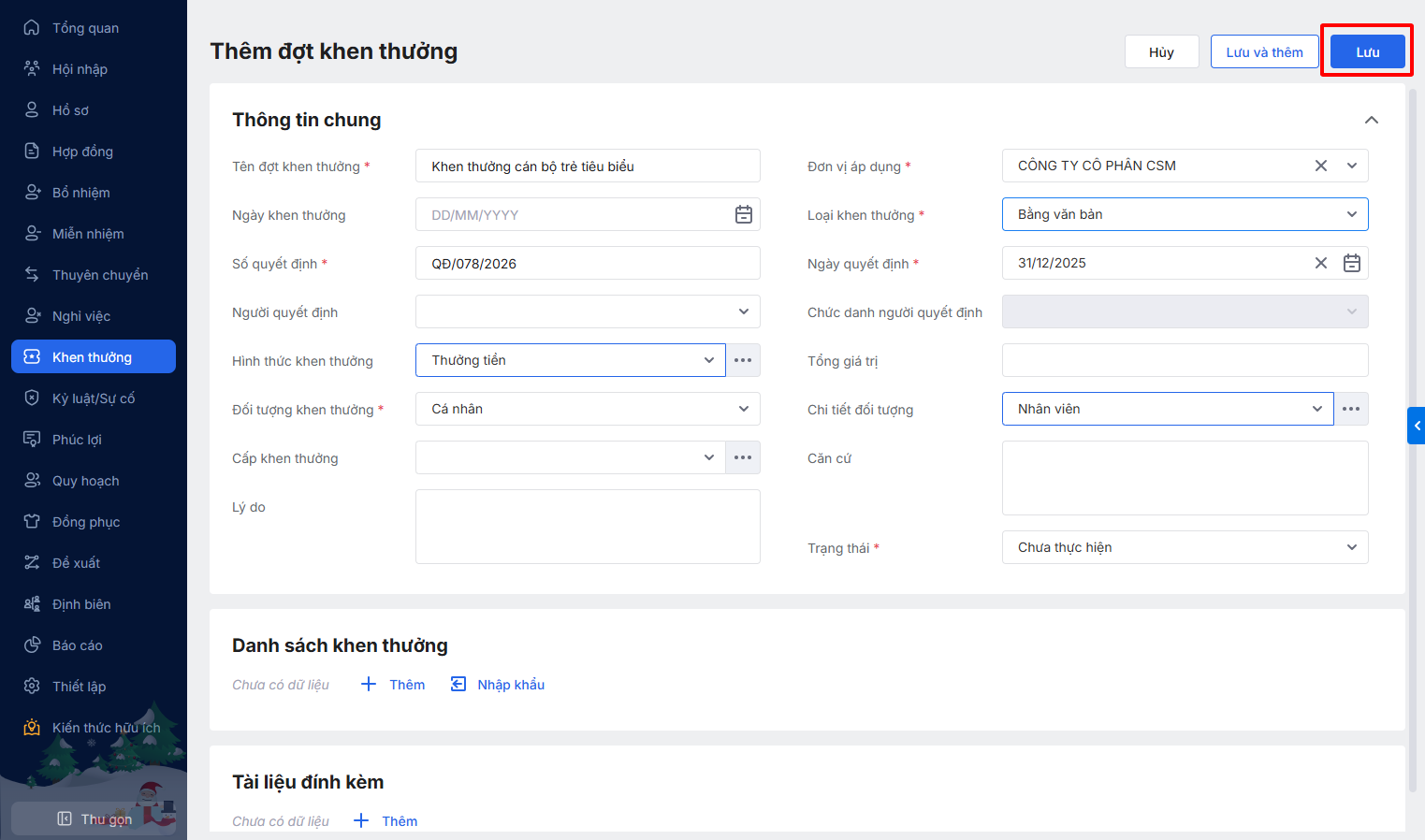 Bài viết hướng dẫn quy trình khai báo và quản lý các đợt khen thưởng cho nhân viên trong đơn vị. Sau khi một đề xuất khen thưởng đã được phê duyệt, HR có thể sử dụng chức năng này để tạo quyết định khen thưởng chính thức, ghi nhận thành tích và làm cơ sở cho các nghiệp vụ liên quan như tính lương, thưởng, đảm bảo việc ghi nhận công lao của nhân viên được thực hiện một cách chuyên nghiệp và có hệ thống.
