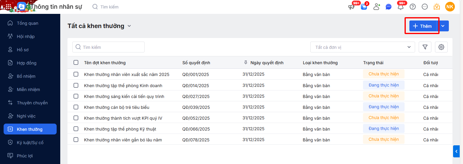 Bước 1: Tại phần mềm thông tin nhân sự, truy cập phân hệ Khen thưởng\Nhấn Thêm