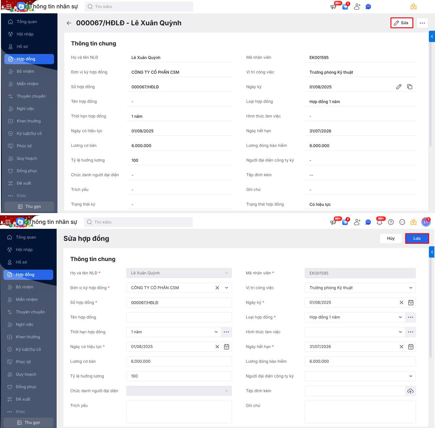 Ví dụ: Sửa 1 hợp đồng cho nhân viên. Thực hiện thao tác như sau: