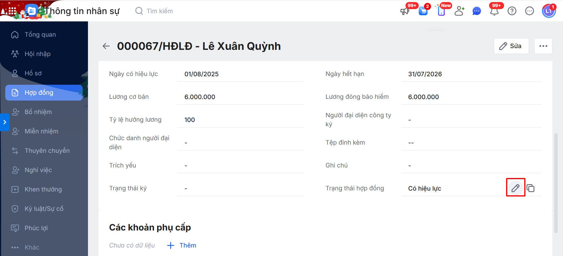 Bài viết hướng dẫn thao tác sửa trạng thái hợp đồng từ “Hết hiệu lực” sang “Có hiệu lực” trên giao diện Xem/Sửa hợp đồng trong phần mềm quản lý nhân sự. Nội dung bao gồm các bước thực hiện và lưu ý khi cập nhật trạng thái. Áp dụng cho người dùng có quyền HR trong hệ thống.