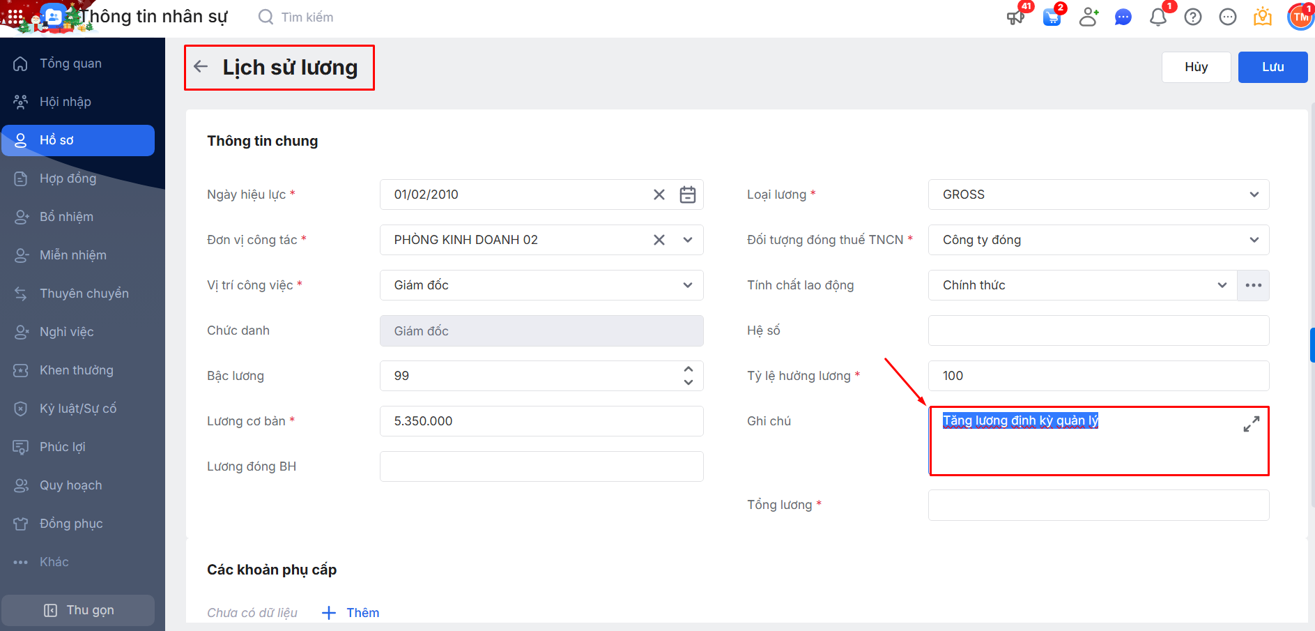 Trên giao diện chi tiết Hồ sơ nhân viên\ Tại mục Lịch sử lương\ Bổ sung cột Ghi chú\ Thêm các diễn giải tại cột này để có căn cứ tiện tra cứu lại về sau.