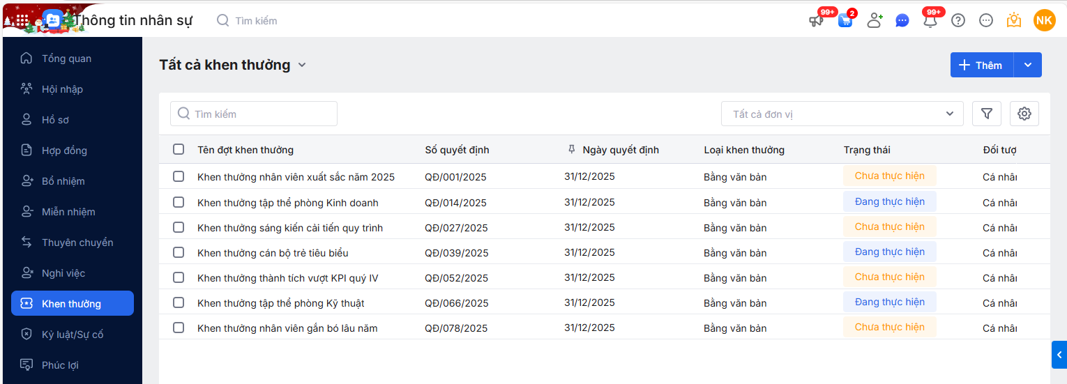Bước 1: Tại phần mềm thông tin nhân sự, truy cập phân hệ Khen thưởng