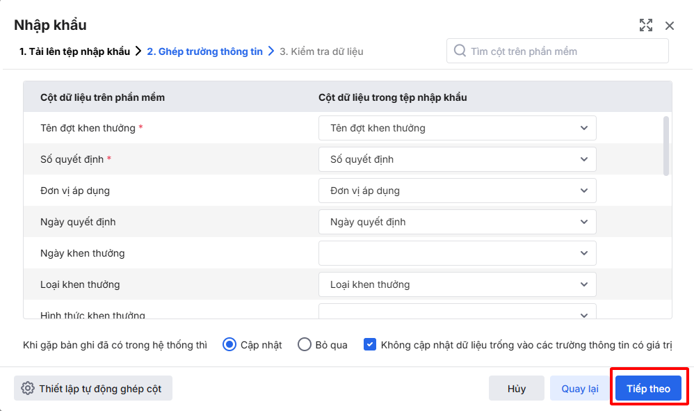 • Chương trình sẽ tự động đọc thông tin và ghép các cột dữ liệu trong tệp tương ứng với cột trên phần mềm.