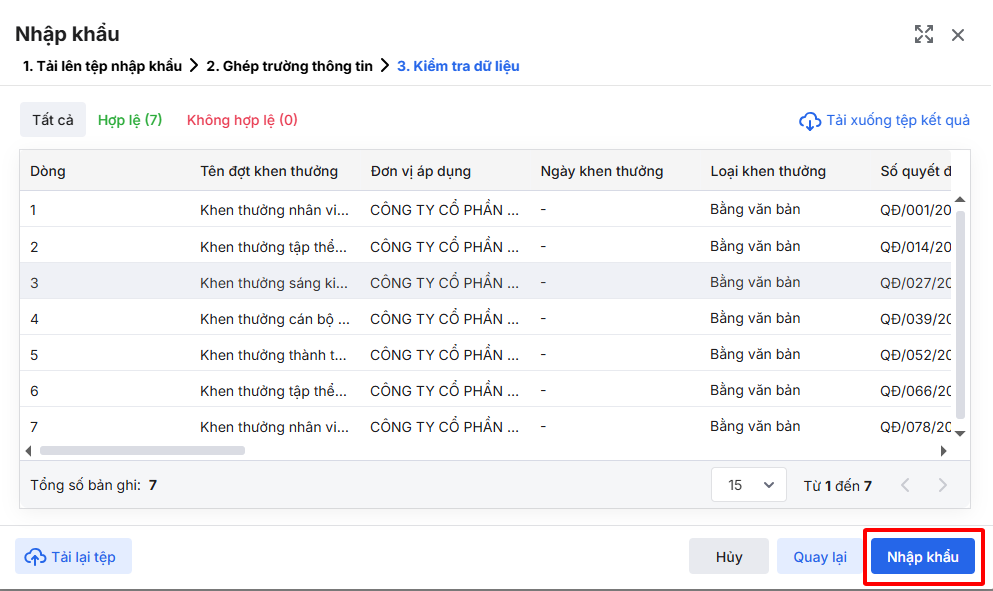 Bước 5: Kiểm tra kết quả. Nhấn Nhập khẩu để hoàn tất