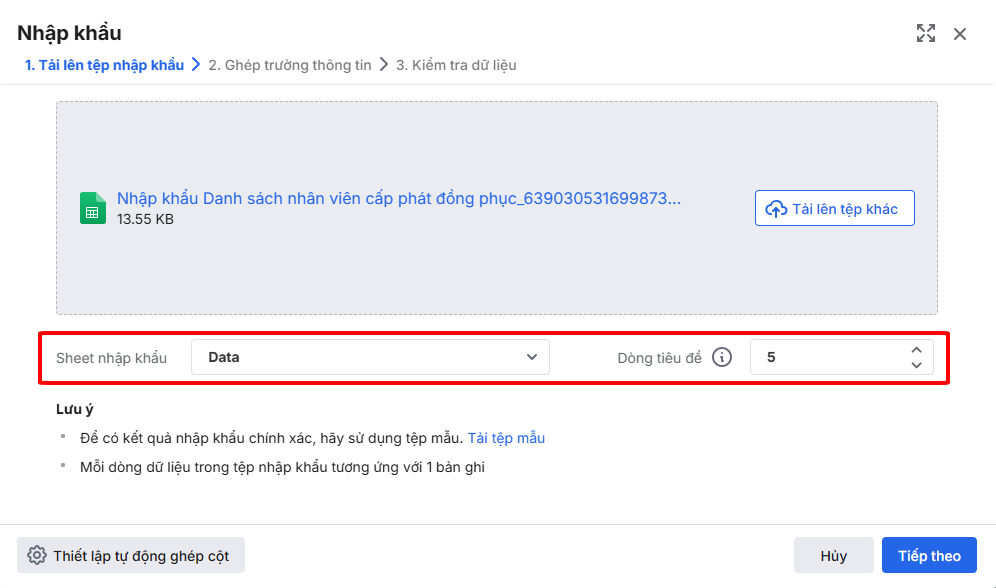 Bước 5: Tải lên tệp nhập khẩu – Nhấn Tiếp theo