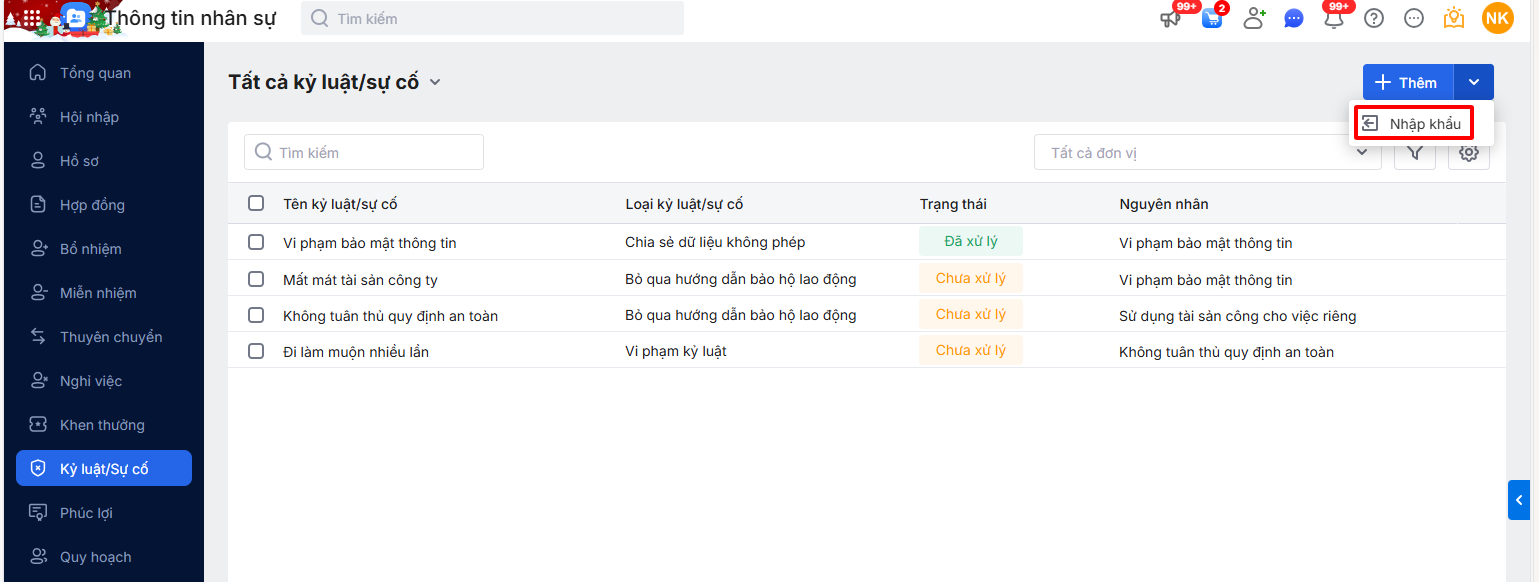 Bước 1: Tại phần mềm thông tin nhân sự, truy cập phân hệ Kỷ luật/sự cố