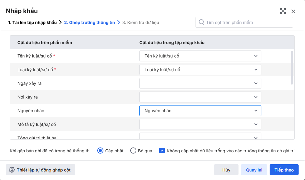 - Chương trình sẽ tự động đọc thông tin và ghép các cột dữ liệu trong tệp tương ứng với cột trên phần mềm.