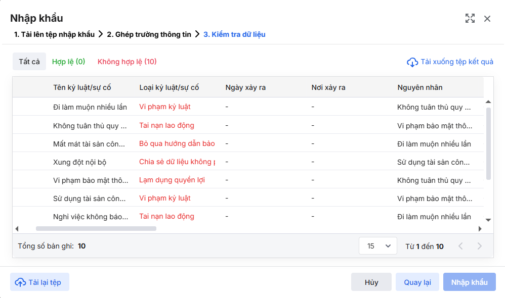 Khi đó, mỗi đợt sự cố nhập thành 1 dòng trên file nhập khẩu. Nếu một trong các đợt sự cố đó có nhiều nhân viên/đơn vị gặp sự cố thì mỗi nhân viên/đơn vị tách thành 1 dòng.