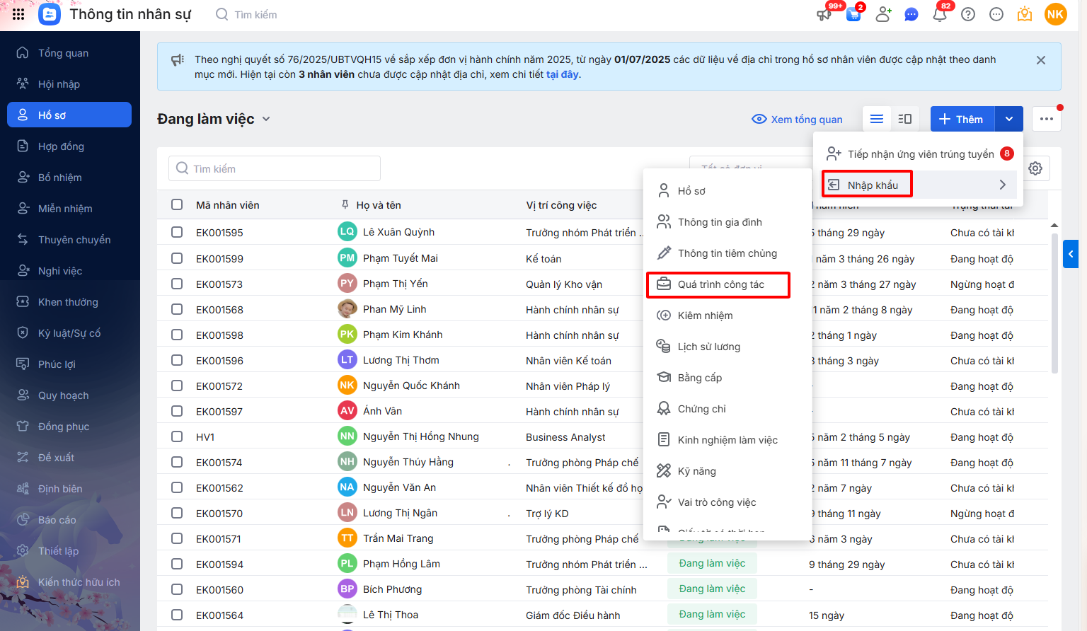 Bài viết hướng dẫn cách sử dụng chức năng Nhập khẩu Quá trình công tác trên hệ thống. Việc này giúp ghi nhận và quản lý một cách nhanh chóng, tiết kiệm thời gian nhập liệu thủ công, đặc biệt khi cần cập nhật hàng loạt dữ liệu đã có sẵn, đảm bảo thông tin được lưu trữ đầy đủ và chính xác.