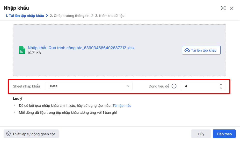 Bước 3: Tải lên tệp nhập khẩu. Nhấn Tiếp theo
