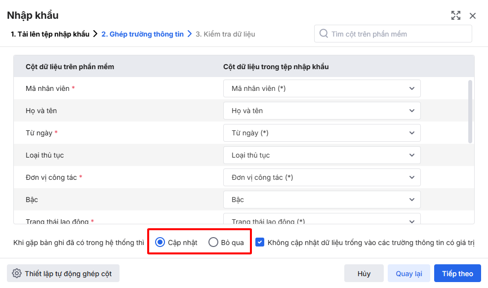 • Cập nhật: Cập nhật dữ liệu từ tệp nhập khẩu vào bản ghi đã có.