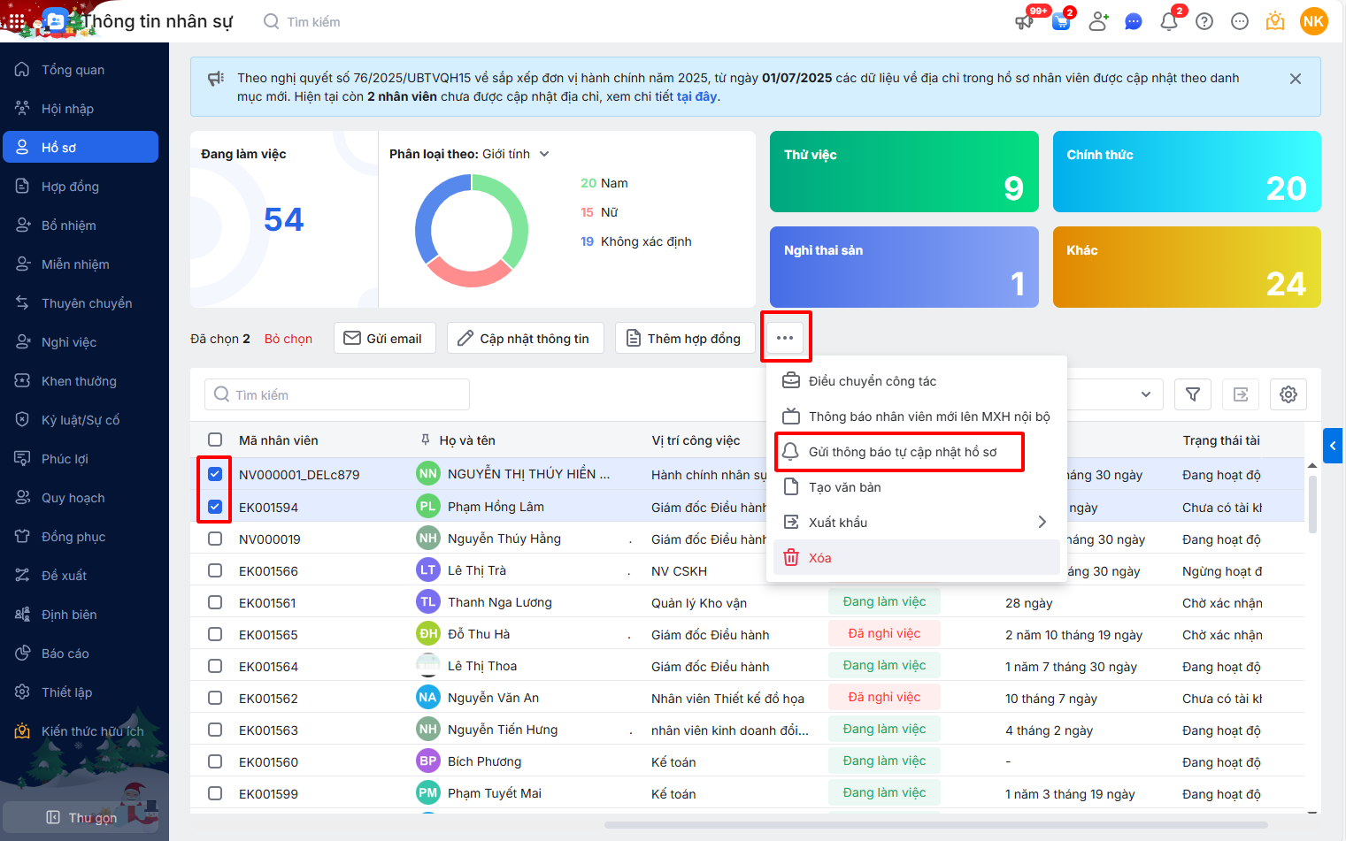 Bước 2: Tích chọn nhân viên muốn gửi thông báo, nhấn biểu tượng ba chấm \chọn Gửi thông báo tự cập nhật hồ sơ.