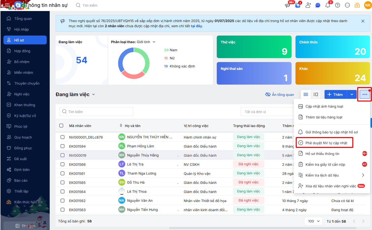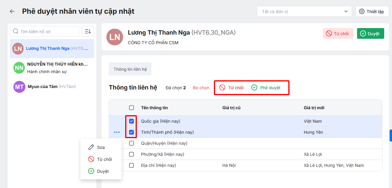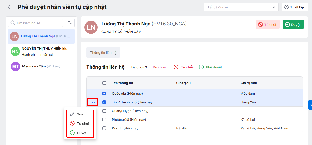 Bước 2: Nhấn biểu tượng ba chấm \chọn Phê duyệt NV tự cập nhật