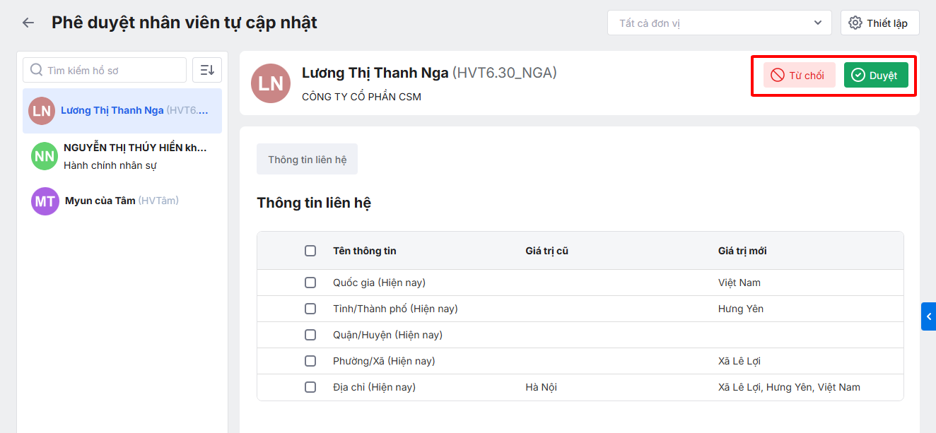 • Khi từ chối, có thể nhập lý do để nhân viên nắm được thông tin và cập nhật lại hồ sơ cho chính xác.