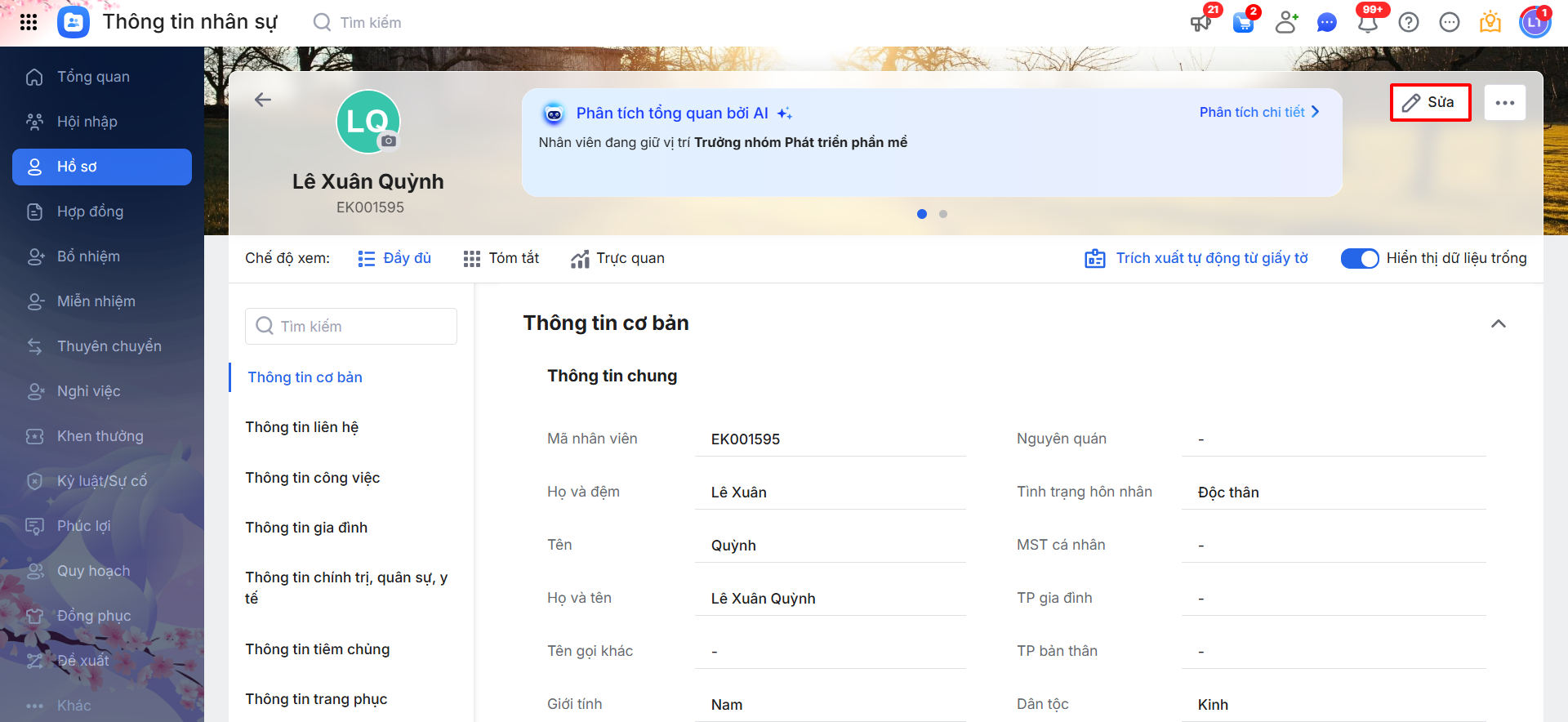 Cách 2: Hoặc, vào chi tiết hồ sơ \ di chuột vào trường muốn sửa và nhấn biểu tượng ✎ để có thể sửa nhanh một trường thông tin trên hồ sơ: