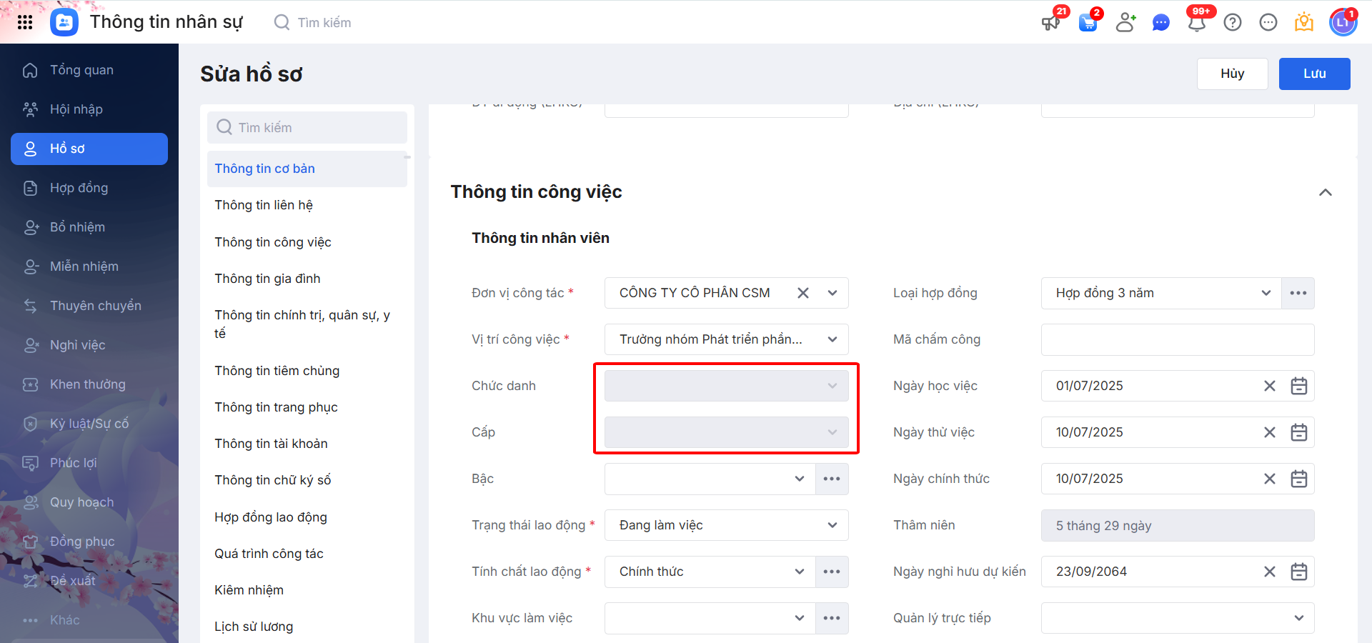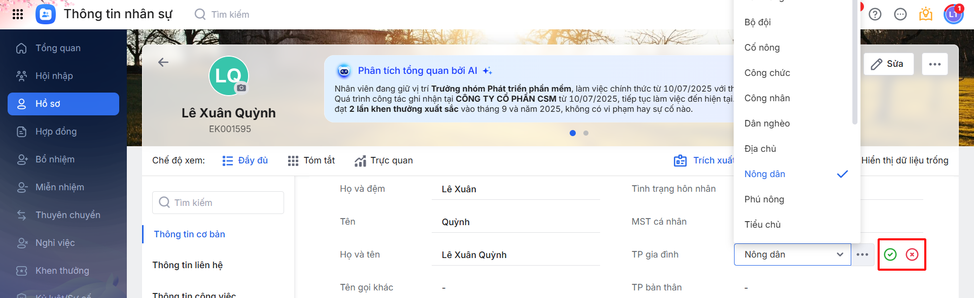 Lưu ý: Đối với các trường thông tin được bôi xám và không cho phép chỉnh sửa, cần truy cập đúng phân hệ/phần thông tin tương ứng để cập nhật. Sau khi chỉnh sửa tại đó, các thông tin này sẽ tự động được cập nhật trên màn hình hiện tại.