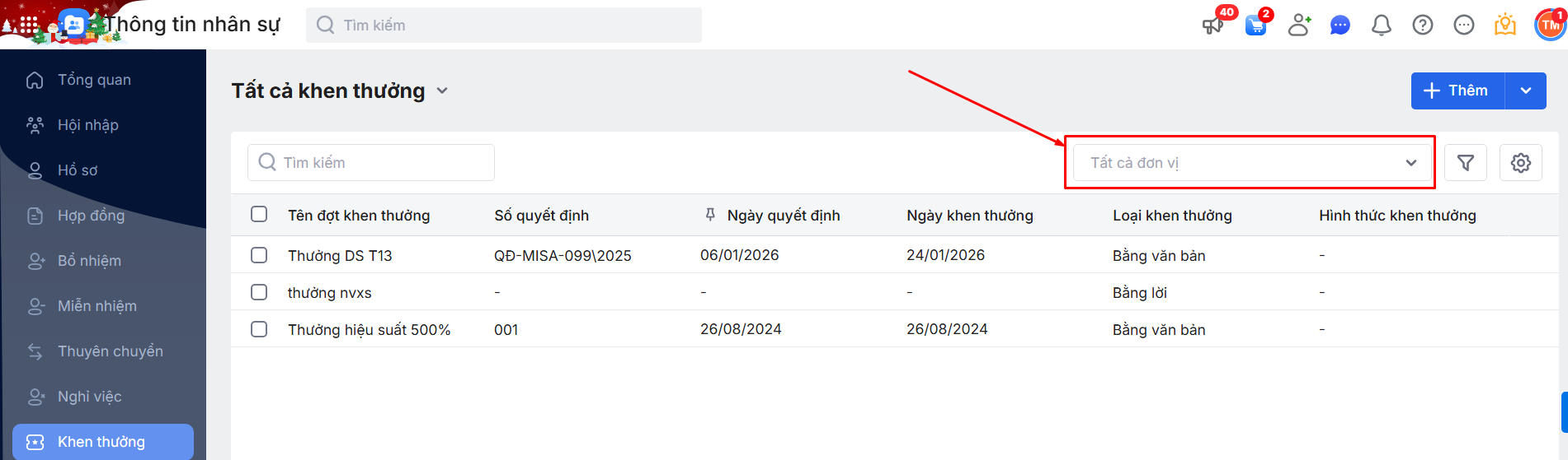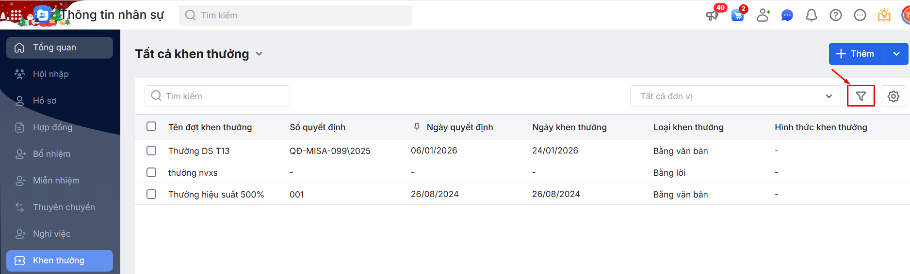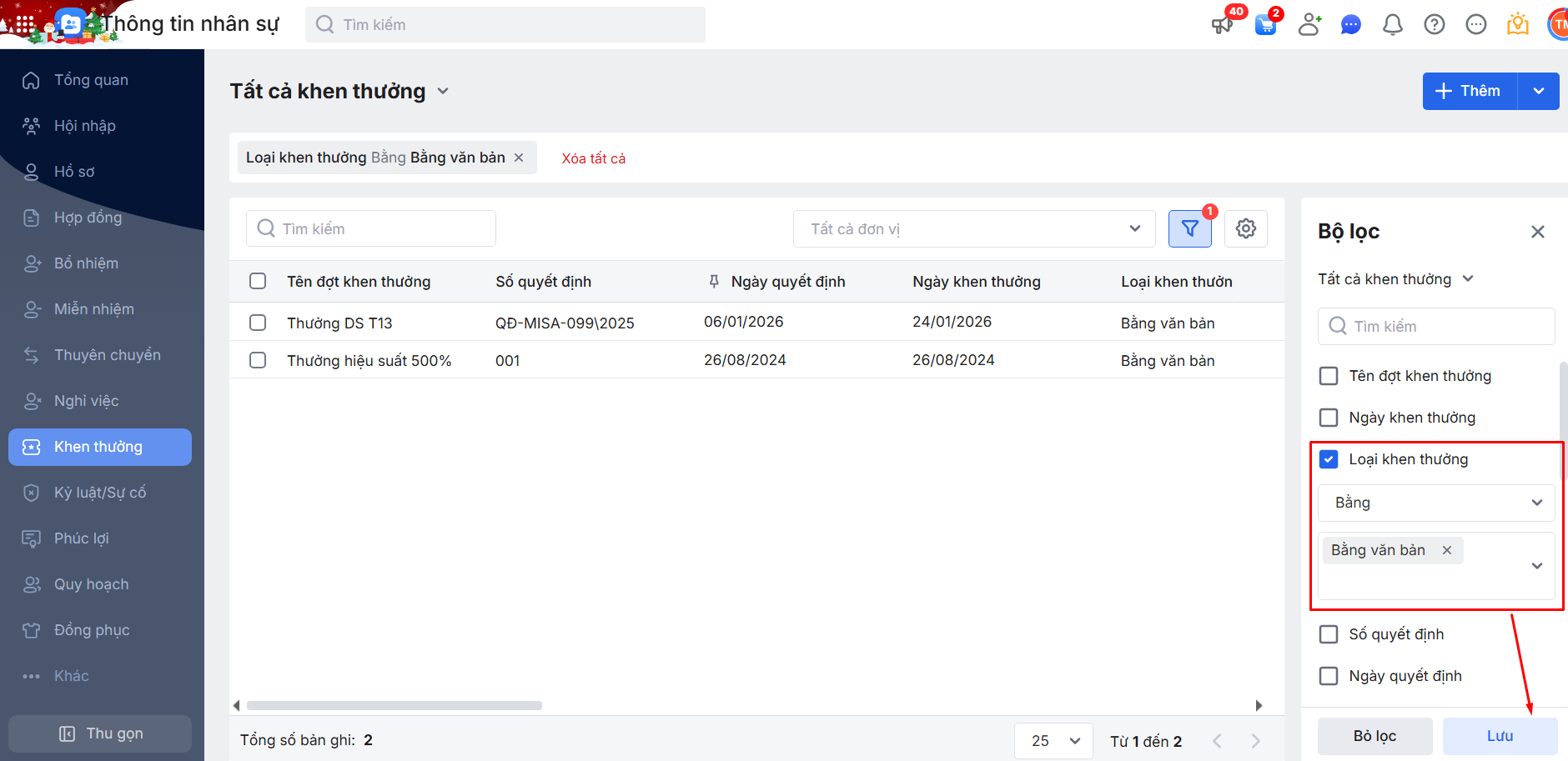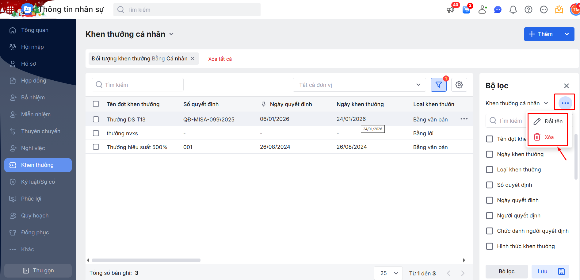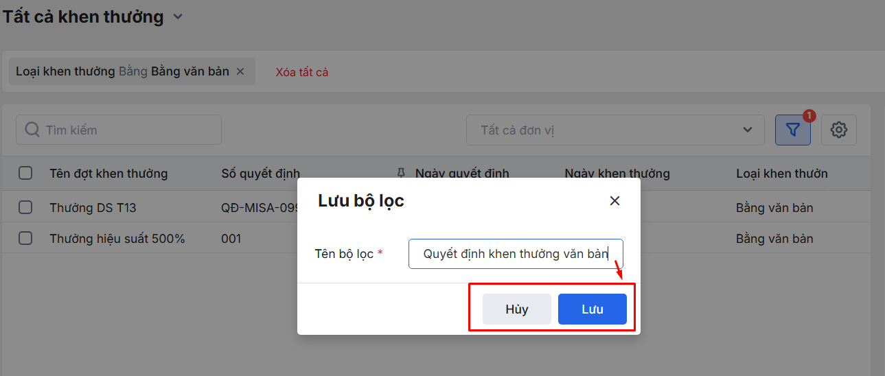 2.2. Bộ lọc danh sách đợt Khen thưởng