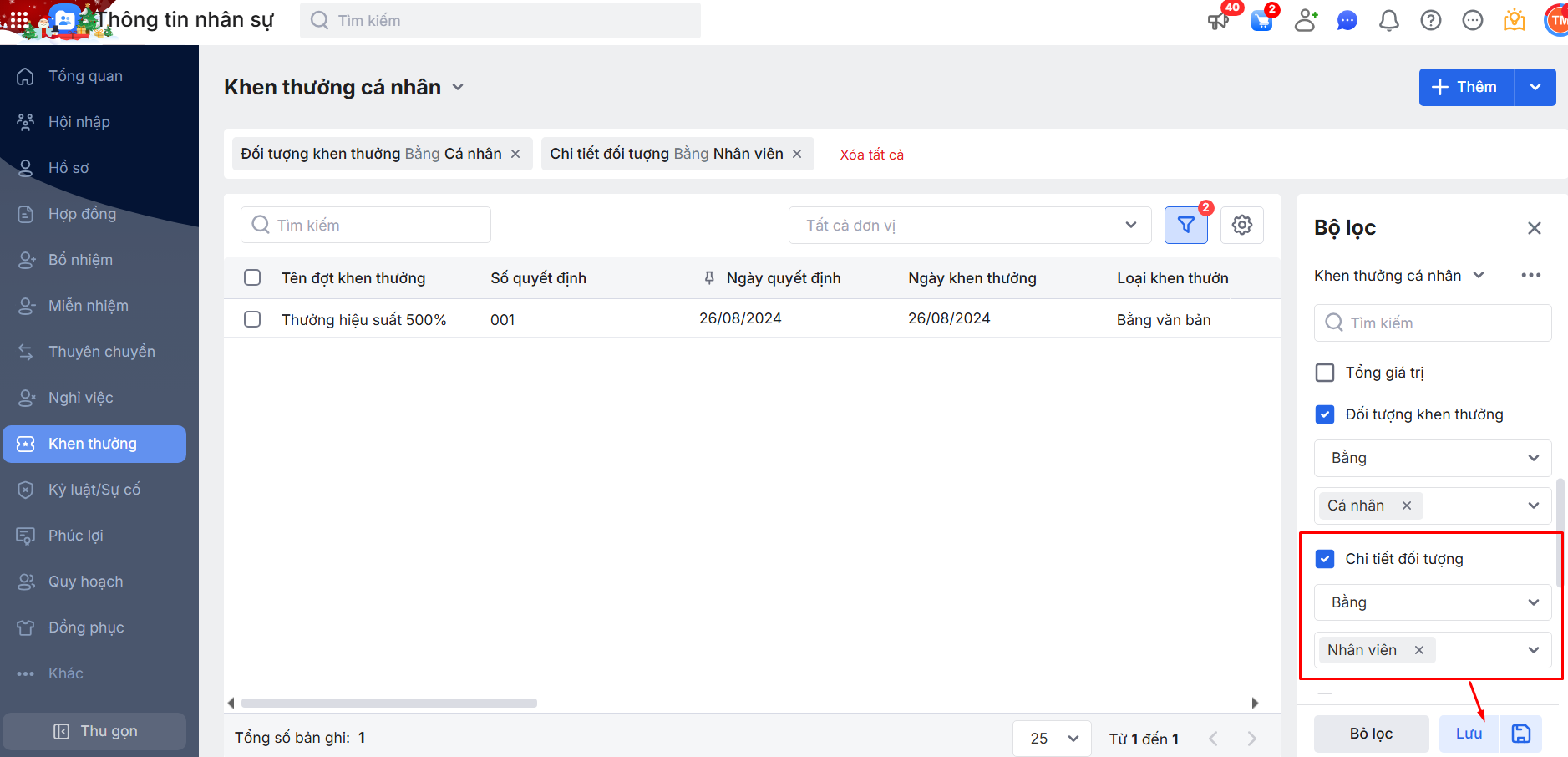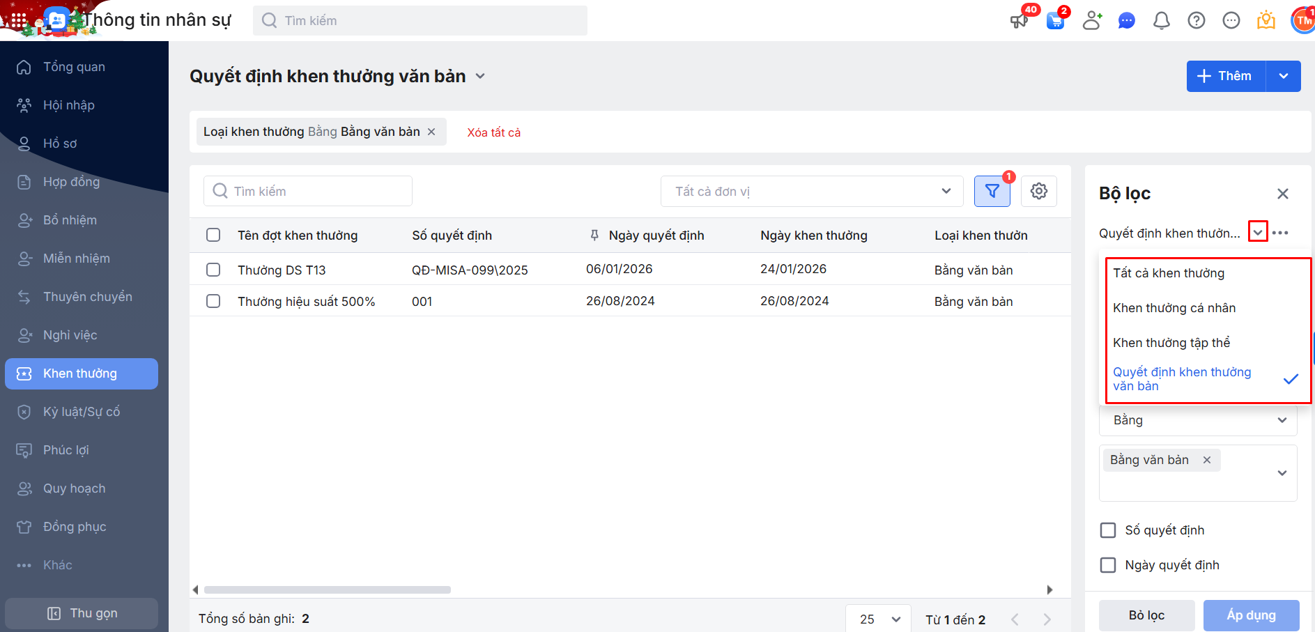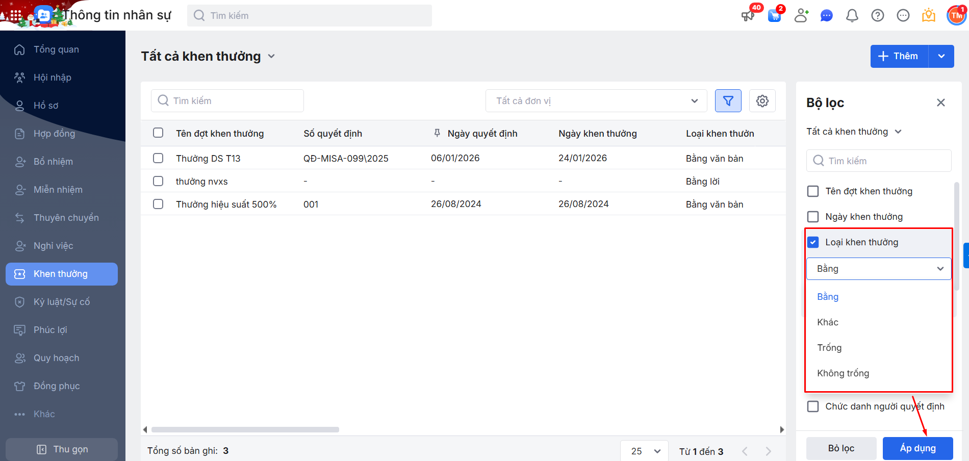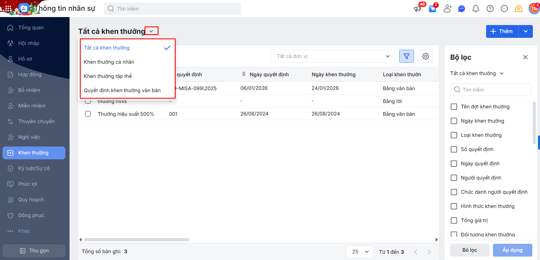 2.2. Bộ lọc danh sách đợt Khen thưởng