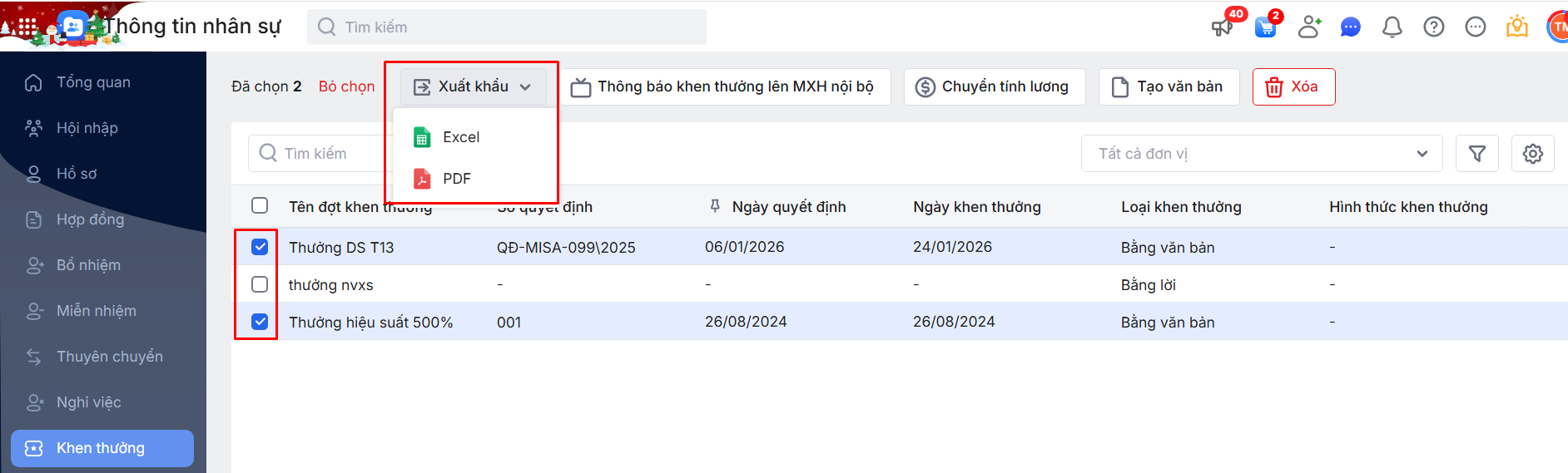 Bước 1: Tích chọn một số đợt Khen thưởng\ Nhấn chọn xuất khẩu