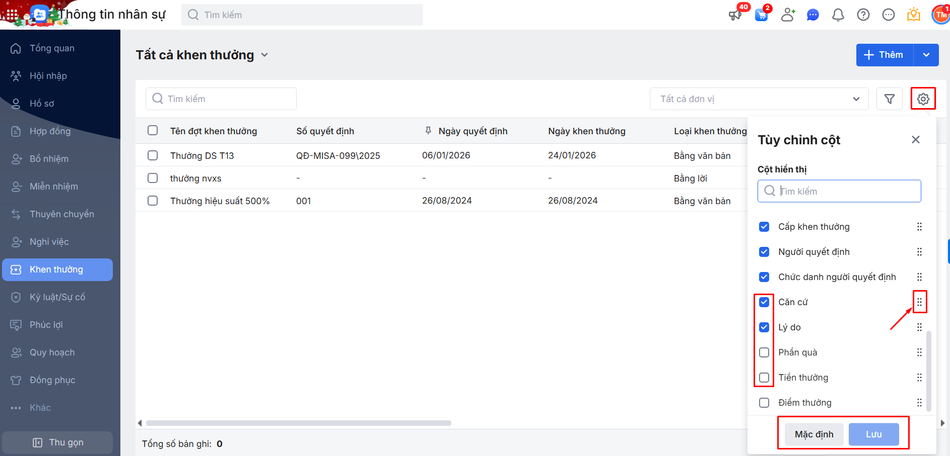 2.4. Tùy chỉnh cột hiển thị trên danh sách đợt Khen thưởng