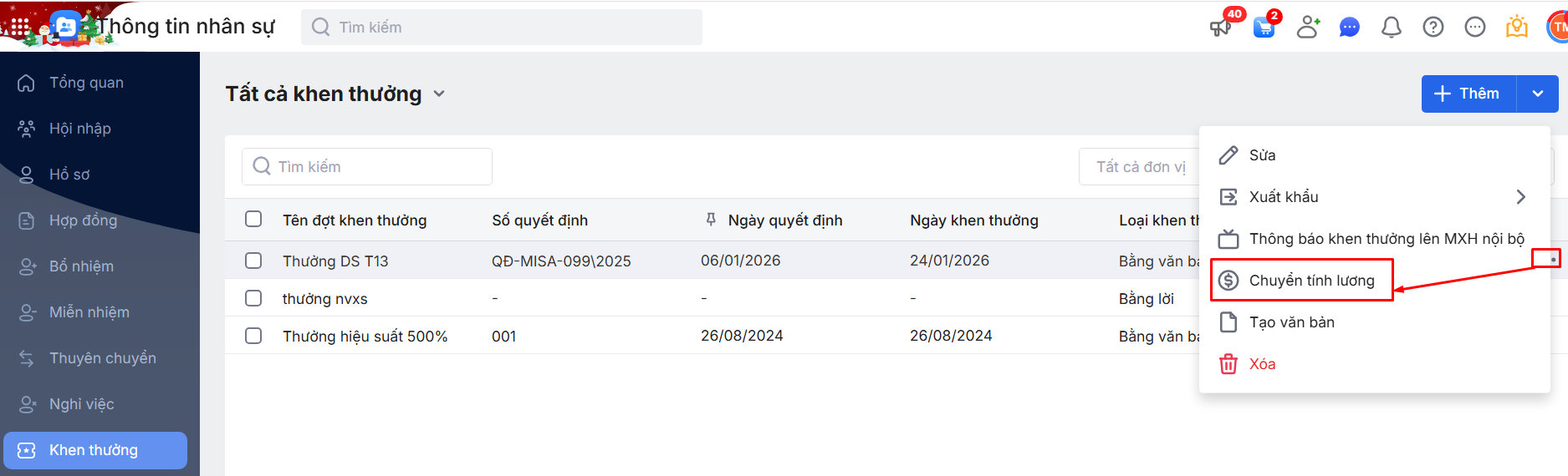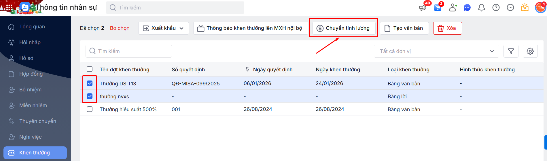 Bước 1: Tích chọn các đợt Khen thưởng cần chuyển tính lương\ Chọn chức năng Chuyển tính lương.