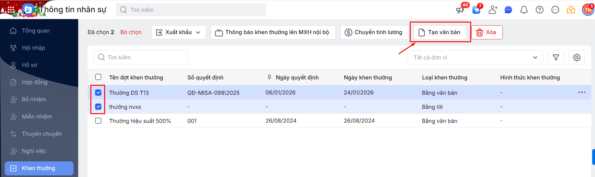 2.6. Tạo văn bản cho các đợt Khen thưởng