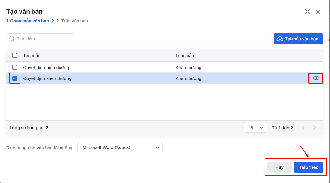 Bước 2: Tích chọn mẫu để trộn tạo văn bản (Xem hướng dẫn thiết lập mẫu tạo văn bản tại đây)\ Di chuột vào tên mẫu nhấn vào biểu tượng con mắt