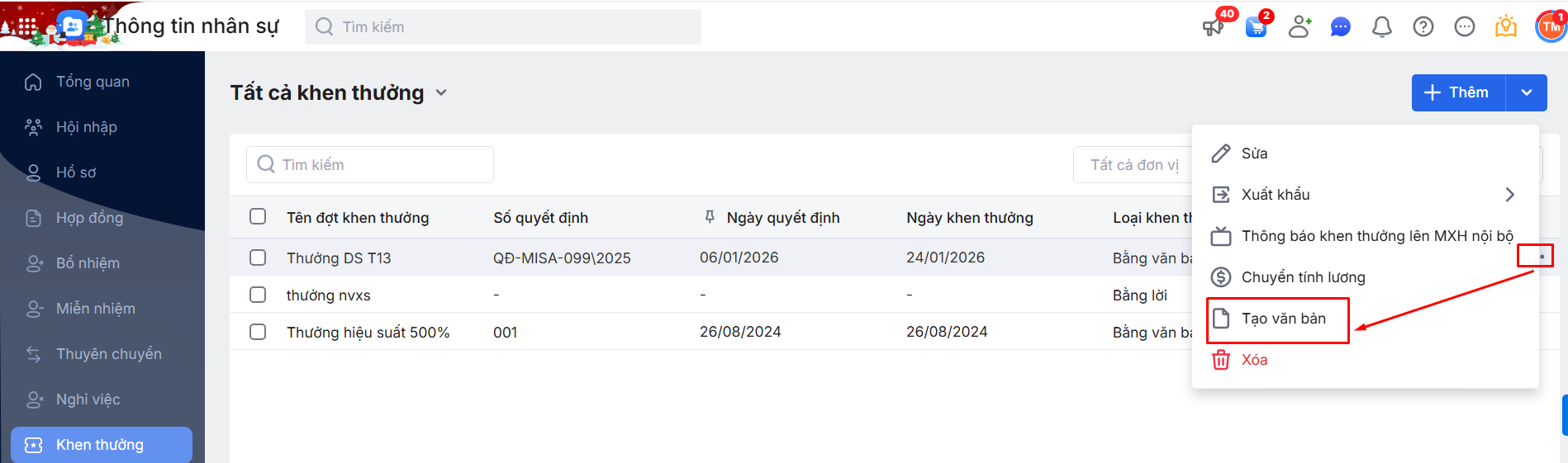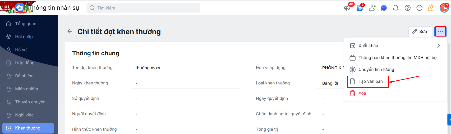 Hoặc nhấn vào 1 bản ghi đợt Khen thưởng chi tiết để Tạo văn bản cho riêng đợt Khen thưởng bằng cách nhấn vào biểu tượng dấu ba chấm