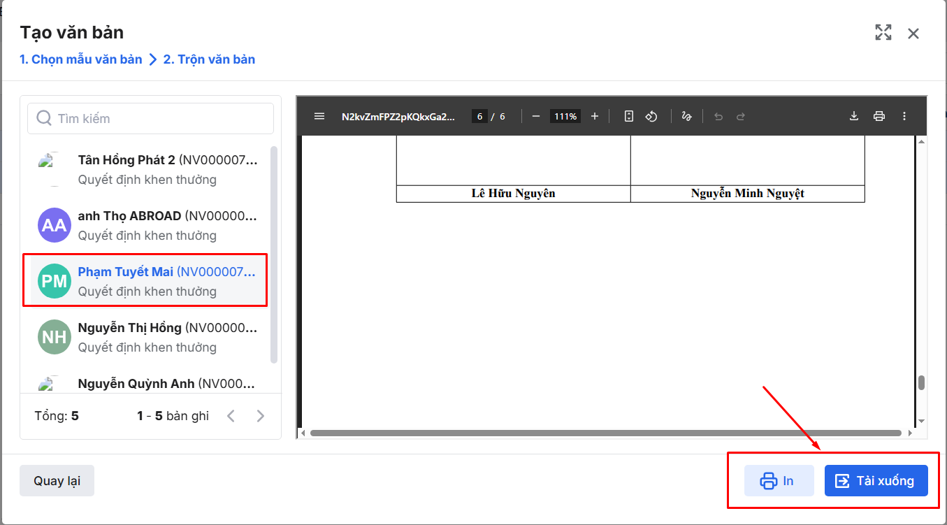 Bước 3: Nhấn chức năng Tải xuống hoặc In để sử dụng văn bản sau trộn.