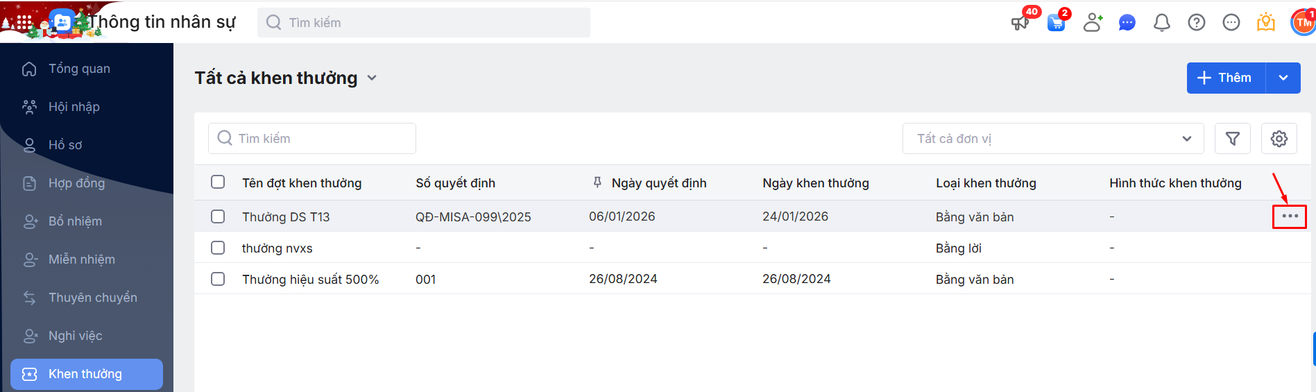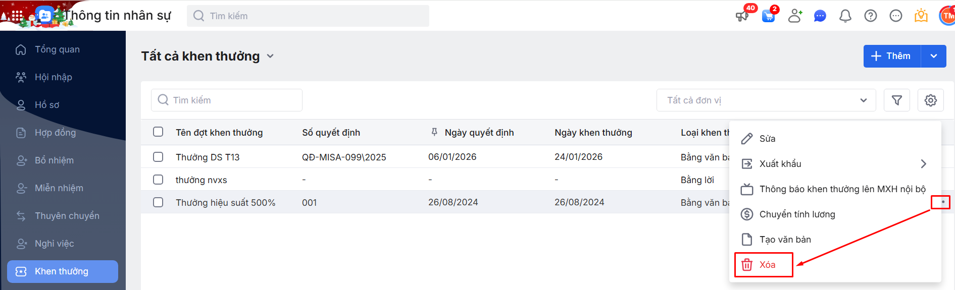 Hoặc di chuột vào đợt Khen thưởng\ Nhấn biểu tượng dấu ba chấm
