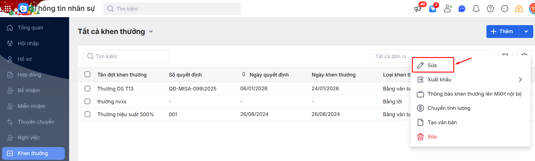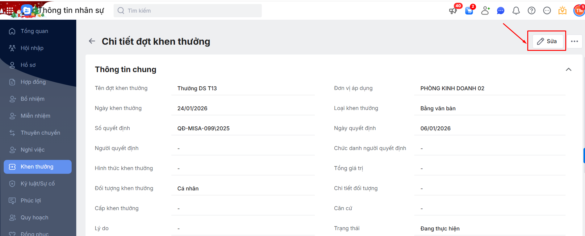Hoặc Nhấn vào một đợt Khen thưởng chi tiết\ Chọn chức năng Sửa.