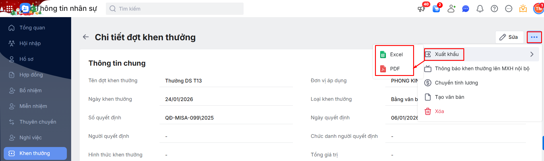 Bước 1: Di chuột vào một đợt Khen thưởng cần xuất khẩu\ Nhấn biểu tượng dấu ba chấm