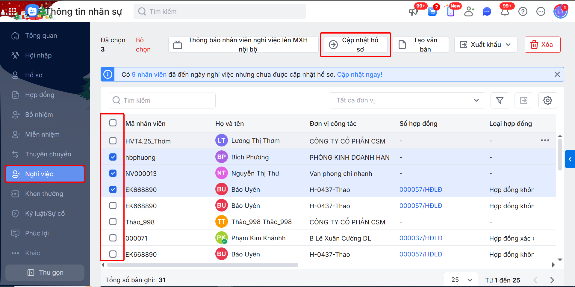 Bước 1: Vào phân hệ Nghỉ việc \ tích chọn nhân viên nghỉ việc \ sau đó nhấn Cập nhật hồ sơ.