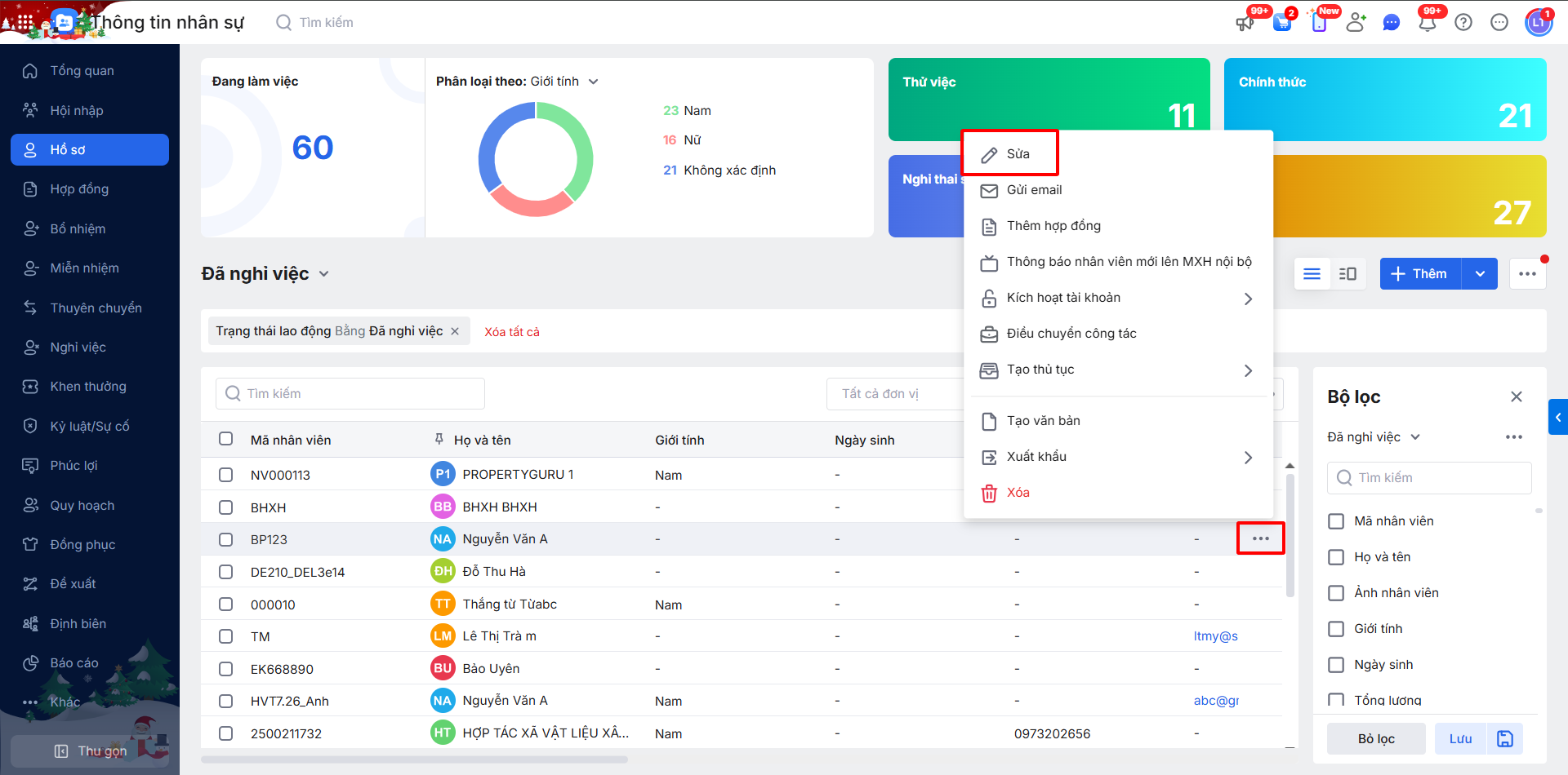 Bước 3: Di chuột vào hồ sơ nhân viên muốn đưa vào Danh sách đen \ nhấn biểu tượng dấu ba chấm … \ chọn Sửa.