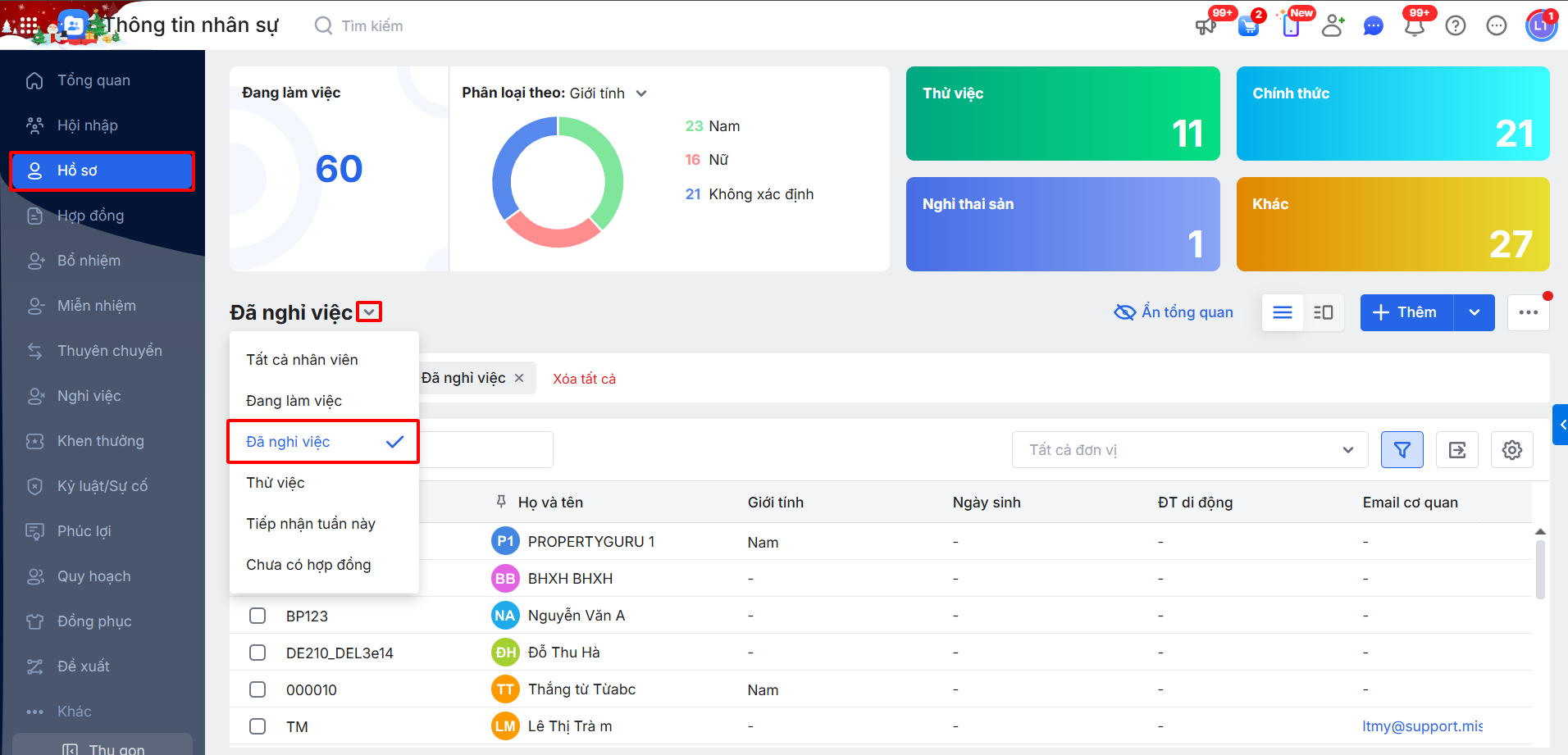 Bước 1: Vào phân hệ Hồ sơ \ ấn mũi tên xuống \ chọn hồ sơ của nhân viên được cập nhật trạng thái lao động là Đã nghỉ việc.