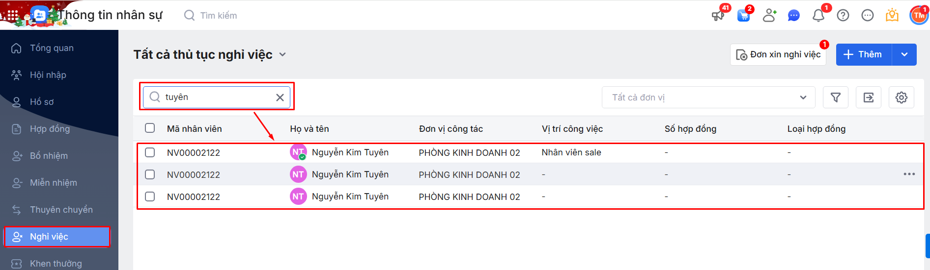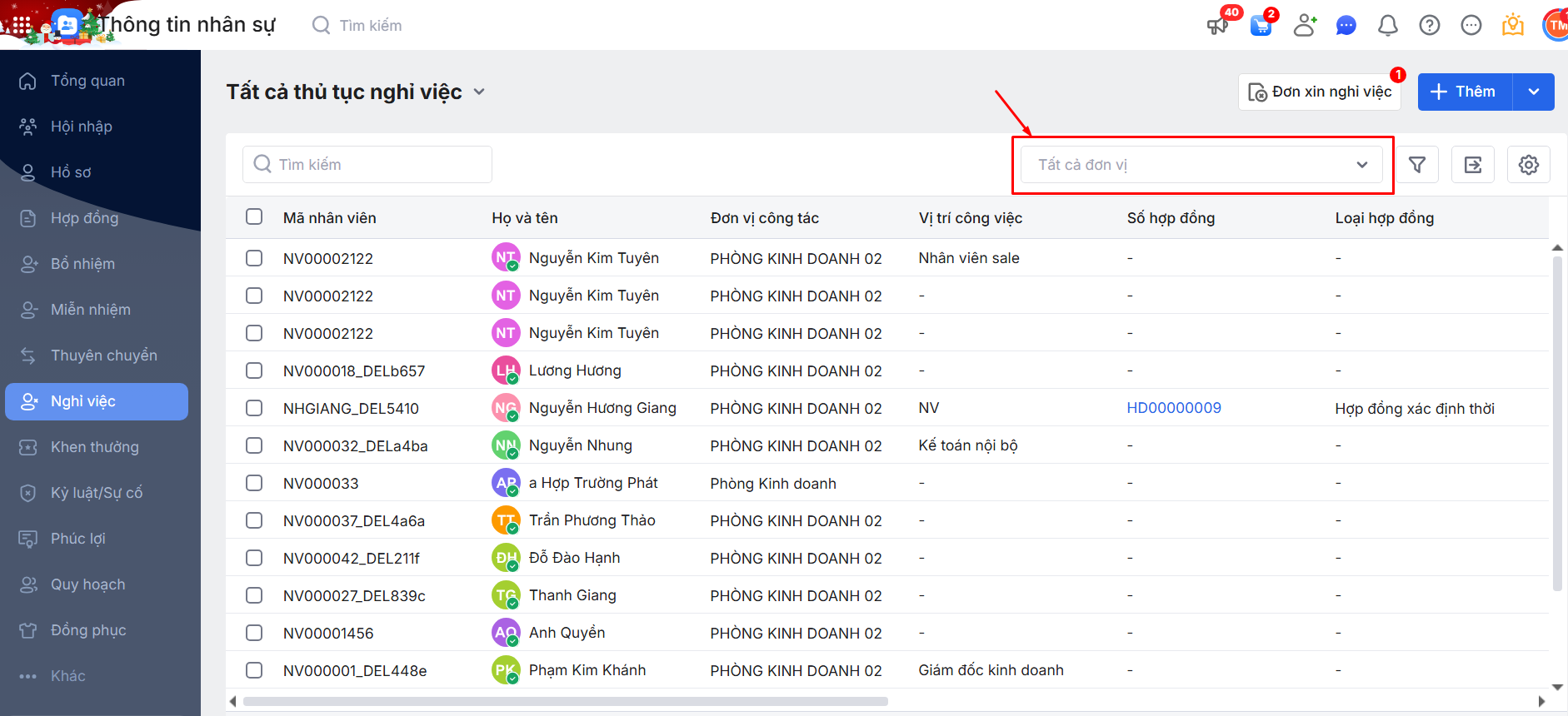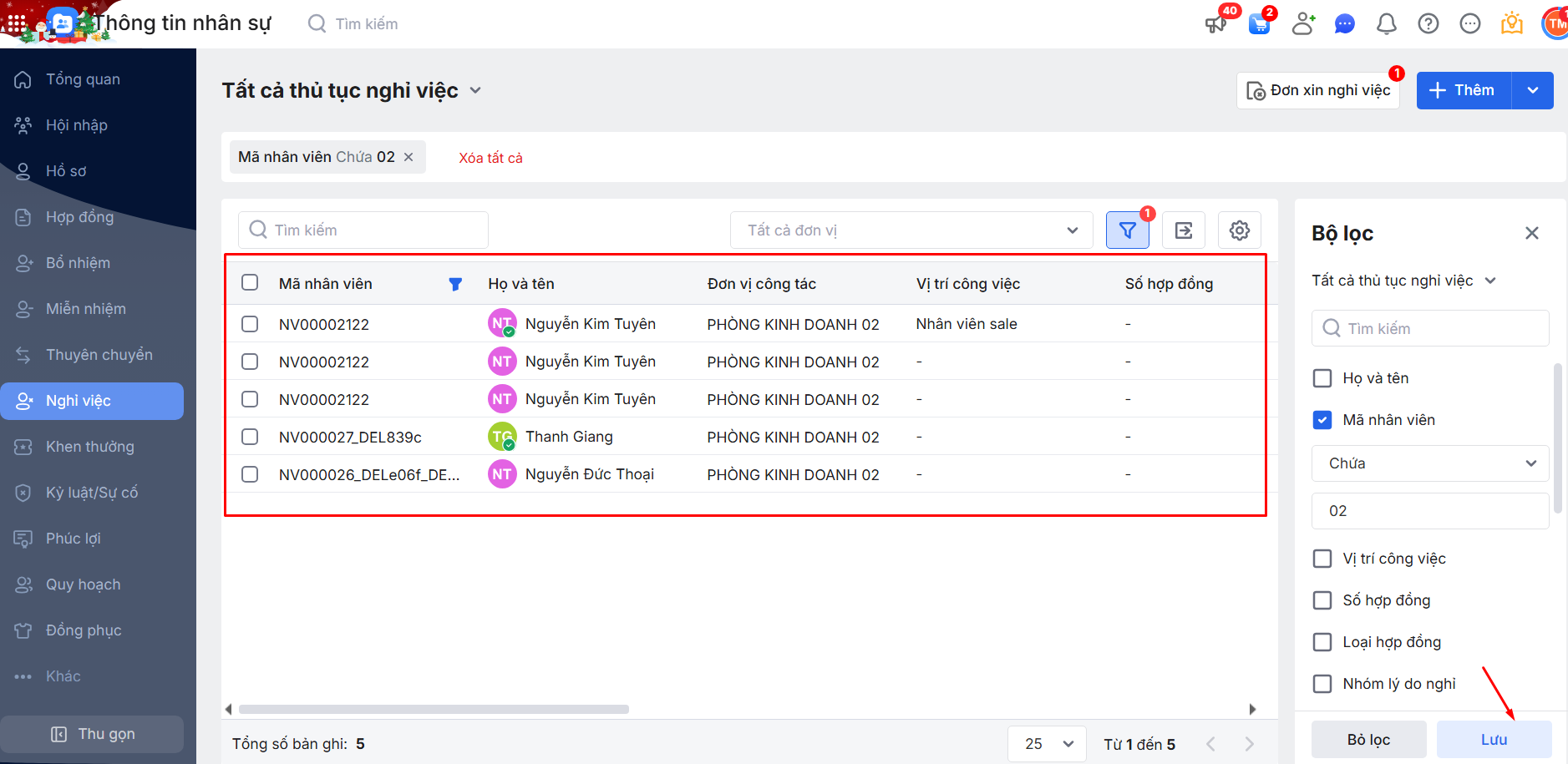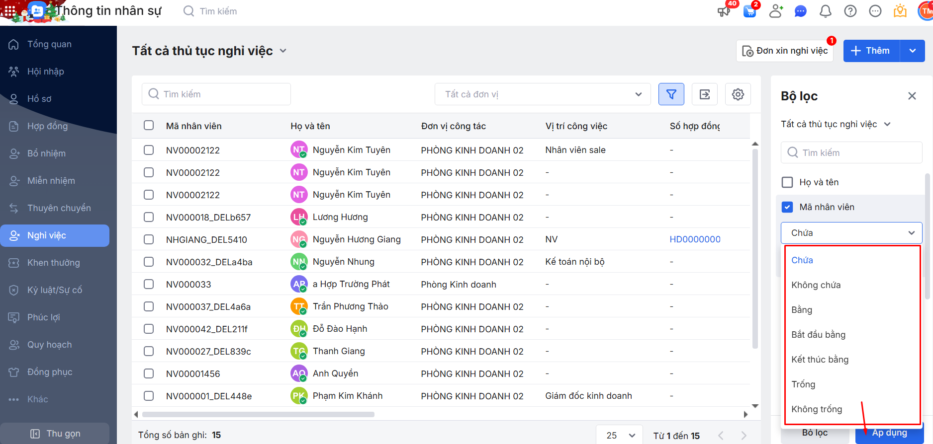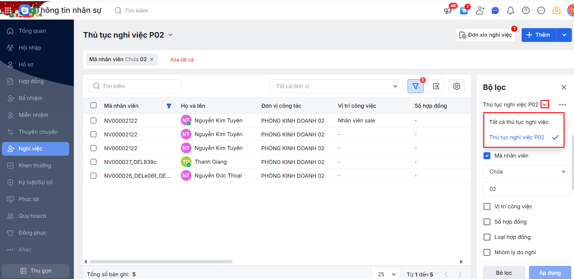 2.2. Bộ lọc danh sách thủ tục Nghỉ việc