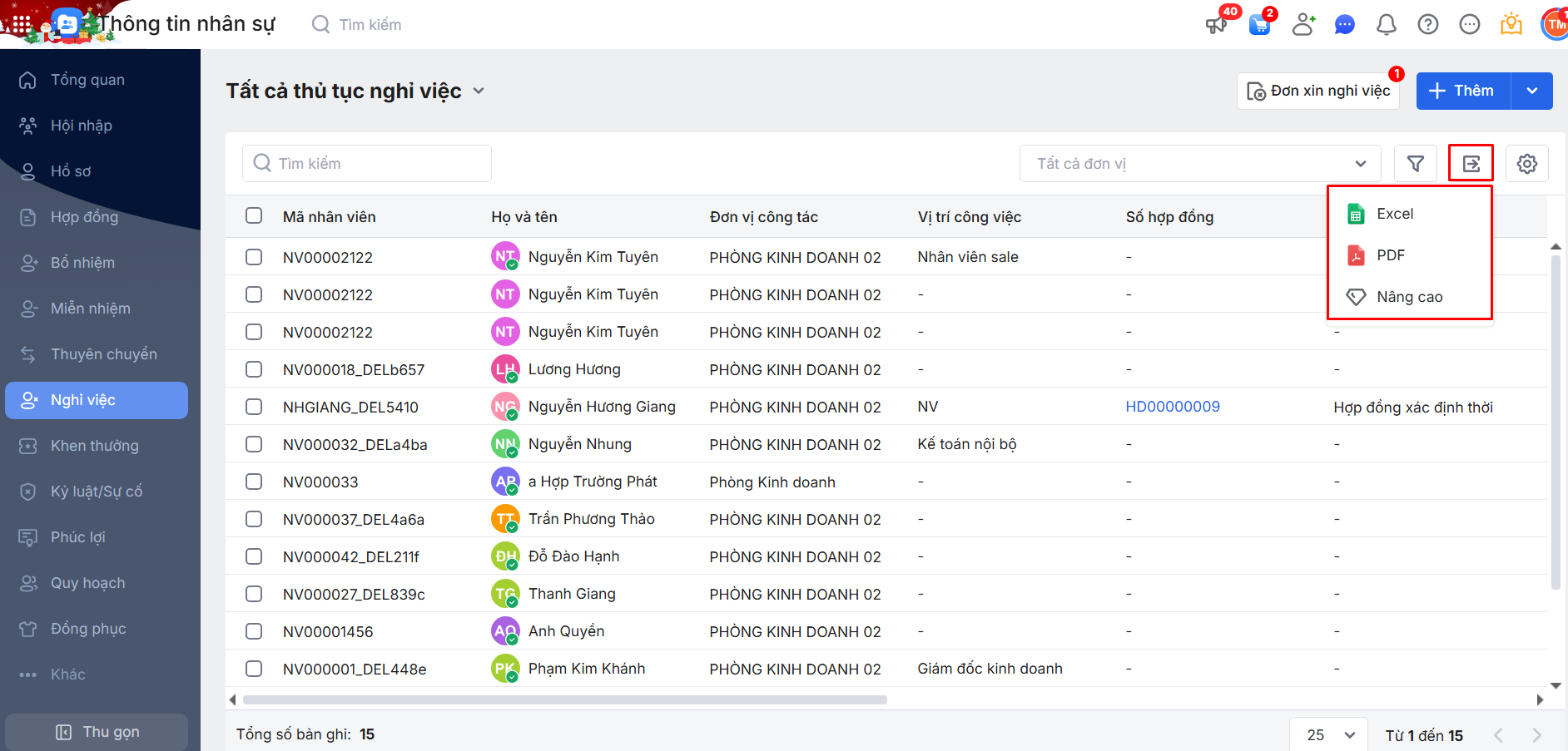 2.3. Xuất khẩu danh sách thủ tục Nghỉ việc của nhân viên