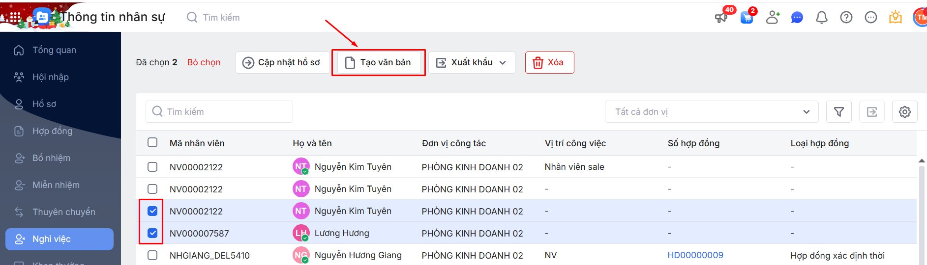 Bước 1: Tích chọn các thủ tục Nghỉ việc cần cập nhật thông tin\ Chọn chức năng Tạo văn bản.